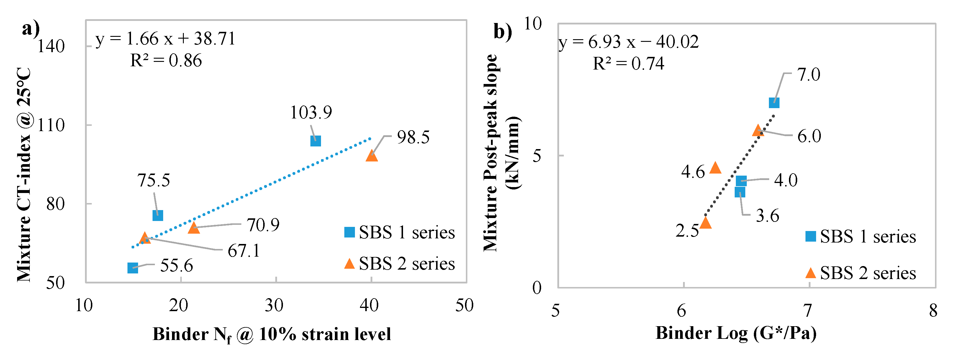 - Correlate the performance-related indices between the binder and mixture and identify the binder parameters that can be used to predict the mixture cracking performance.