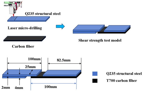 Single-lap shear specimens were fabricated using 2 mm thick Fe plates (iron plates (purity: 99.8%) of Grade Q235 were supplied by Taizhou Guixin Metal Products Co., Ltd., Taizhou, China) bonded to a unidirectional carbon fiber/epoxy prepreg (T700-3K, Toray Industries; density: 1.8 g/cm3). Diglycidyl ether of bisphenol-A is provided by Weihai Huixing Fiber Products Co., Ltd., Weihai, China. Laser drilling was performed using industrial equipment (supplier: Changzhou Juling Intelligent Technology Co., Ltd., Changzhou, China).