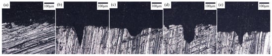The laser drilling parameters for Fe surfaces are detailed in Section 2.2, demonstrating suitability for metal surface treatment. Figure 3 presents optical micrographs of interfaces with different laser-perforated geometries at identical magnification. Figure 3a depicts the untreated Fe–epoxy interface, revealing a roughened Fe surface devoid of resin adhesion. Surface cavities indicate interfacial strength defects between Fe and epoxy resin.