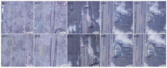 Figure 5 presents optical micrographs of Fe surfaces post single-lap shear testing. Figure 5(a1–e2) correspond to untreated control, conical, conical frustum, cylindrical, and frustum-integrated cylindrical cavity treatments, respectively. Figure 5(a1,a2) depicts the untreated Fe surface exhibiting minimal resin adhesion. Figure 5(b1–e2) show conical, conical frustum, cylindrical, and frustum-integrated cylindrical cavity treated surfaces. Notably, in Figure 5(e1,e2), epoxy resin residues (red circles) remain within perforations, demonstrating micro-mechanical interlocking between Fe surface topology and epoxy matrix.