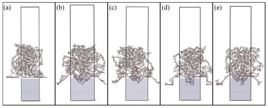 Fe-DGEBA system MD simulation models.: (a) prototype; (b) conical hole; (c) conical frustum-shaped hole; (d) cylindrical hole; (e) frustum-integrated cylindrical cavity hole.