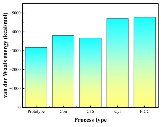 Figure 7 demonstrates significantly enhanced van der Waals forces after Fe surface drilling, indicating substantial bond strength improvement. DGEBA polymer chains conformationally adapt to drilled Fe topologies (Figure 6a–e). Interfacial energy analysis confirms van der Waals interactions dominate adsorption mechanisms, with perforation treatments markedly increasing these forces.