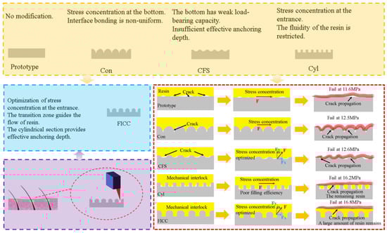 Fe plate surfaces were mechanically polished, ultrasonically cleaned with anhydrous ethanol, and dried at an ambient temperature. Femtosecond laser processing fabricated geometrically varied micrometer-scale holes within a defined 12.5 mm × 25 mm surface region. Identical hole densities were maintained across all geometric configurations. The resin contact area per drilled hole consistently remains 0.09 mm2 across all configurations. For conical holes, the depth measures 0.2 mm with a radius of 0.12 mm. Conical frustum holes exhibit a depth of 0.2 mm, featuring a top radius of 0.09 mm and a bottom radius of 0.05 mm. Cylindrical holes maintain a 0.2 mm depth with a uniform radius of 0.10 mm. Finally, frustum-integrated cylindrical cavities combine a 0.2 mm depth with a top radius of 0.10 mm and a bottom radius of 0.05 mm. The final specimens were rinsed with distilled water and dried at ambient temperature. The production process is shown in Figure 1.