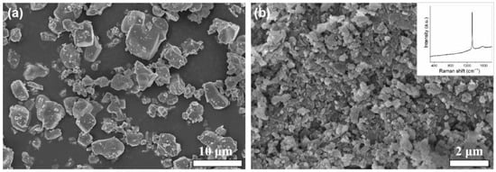 Commercially, TiCN, WC, and Ni powders are used as the starting powders to prepare TiCN-based cermets, and nano-diamond (ND) was used as the strengthening phase. Figure 1 shows the typical SEM images of the TiCN powder and nano-diamond powder. It can be seen that the shape of the TiCN powder particles is multi-angled, with an average size of ~5 μm. The size of the nano-diamond particles is about ~700 nm. The Raman spectrum of nano-diamond shows a strong Raman peak at 1332 cm−1, indicating that the main component of the powder is diamond.