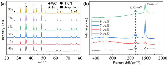 Figure 2 shows the XRD patterns and Raman spectra of the prepared TiCN-based cermets with different contents of nano-diamond. In the sample without the nano-diamond addition, the peaks of TiCN, WC, and Ni were detected. In the samples with the nano-diamond addition, the peaks of the graphite were detected in addition to the peaks of TiCN, WC, and Ni. As the amount of nano-diamond added increased, the intensity of the graphite peak gradually increased. The peaks of the diamond are not obvious in all the samples. The main reasons for the failure to detect the peaks of the diamond might be the low content of nano-diamond, the weaker peak intensity of diamond compared to that of TiCN and WC, and the graphitization of diamond during sintering. However, graphite peaks at 26.5° were detected in the samples with the diamond addition exceeding 3 wt.%, indicating that the nano-diamond underwent graphitization during the sintering process of the samples.