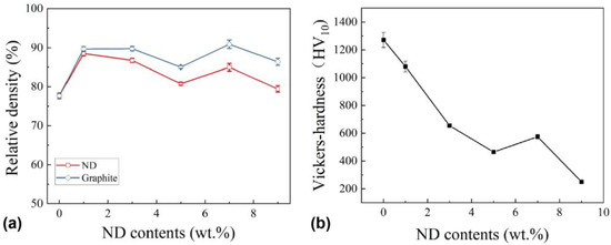 Figure 4a shows the calculated relative densities of the samples with different amounts of added nano-diamond. Relative density is defined as the ratio of the actual density to the theoretical density. Here, the theoretical density of the prepared sample is calculated based on the mixing principle. Through the previous characterization analysis, some of the nano-diamond transformed into graphite during the sintering process, and the proportion of the transformation is difficult to determine. Therefore, the theoretical density and the corresponding relative density of the samples were calculated based on the two extreme cases: the diamond completely transforming into graphite (graphite line in Figure 4a) and no transformation at all (ND line Figure 4a). The actual relative density was between the two curves. It can be seen from the figure that when the content of nano-diamond was 1–3 wt.%, the relative density of the samples slightly increased, up to about 87%, indicating that the sample prepared at this time was relatively dense. However, when the content of nano-diamond reached 5 wt.%, the relative density of the samples decreased. When the content of nano-diamond was 9 wt.%, the relative density of the material decreased sharply. For the sample with 1–3 wt.% added nano-diamond, this may play a role in supplementing the carbon source through graphitization and may have helped reduce decarburization, thereby potentially contributing to densification during sintering. However, when the diamond content continued to increase, too much graphite was generated, resulting in a decrease in the density of the sample.