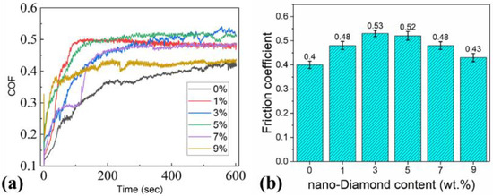 Variation in the (a) COF with time and (b) average friction coefficient with different nano-diamond contents of the prepared cermets.