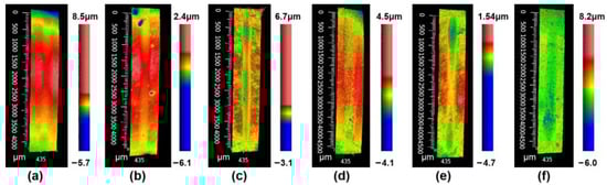 Figure 6 shows the wear morphology of the prepared samples by a 3D white-light interferometer. The long strip in the middle of the figure is the wear mark measurement area. Based on the wear morphology images, the wear volumes of the samples with different amounts of added nano-diamond were measured. Based on the measured wear volumes, the wear rate of the samples was calculated. Here, the wear rate is defined as the wear volume of per unit load and per unit wear distance. The wear rate of the samples is shown in Figure 7. The samples with a nano-diamond addition that did not exceed 7 wt.% exhibited similar wear rates., about 3.1 × 10−5 mm3/Nm. When the added content of nano-diamond reached 9 wt.%, the wear rate of the sample increased sharply to 7.47 × 10−5 mm3/Nm, which was about 2.4 times that of the sample with a smaller added amount of diamond. This increase is consistent with the progressive graphitization-induced hardness reduction observed at higher nano-diamond contents, which leads to a higher wear rate. This is mainly because the nano-diamond undergoes a relatively severe graphitization phenomenon during the sintering, which has been confirmed by both the results of XRD and Raman. Although the relative density of the samples did not change significantly with the increase in the added amount of nano-diamond, their hardness was greatly reduced because of the graphite generated from the diamond. The hardness of the sample with 9 wt.% nano-diamond was only 230 HV10. The low hardness of the sample led to a significant reduction in its wear resistance, resulting in a high wear rate. Although the graphite generated from diamond helps to reduce the friction coefficient of the sample to a certain extent, it is not sufficient to play a role in reducing the friction. Therefore, it is very important to prevent the graphitization of diamond during sintering.