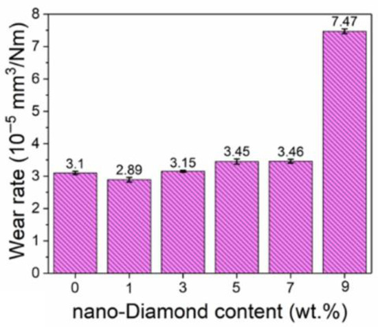 Figure 8 shows the wear mark morphology of the prepared samples. The width of the wear marks ranged from 220 to 300 μm. When the nano-diamond addition content is less than 3 wt.%, the wear marks of the sample are relatively smooth. However, with the further increase in the content of nano-diamond, a lot of the pits appeared on the wear surface. The relatively smooth surface of the grinding marks is mainly attributed to the high density and hardness of the sample. However, when a large amount of diamond is added, a considerable amount of graphite is generated inside the sample, causing a sharp drop in the hardness of the sample. During the friction and wear procedure, the areas with graphite on the surface are prone to peeling off and forming pits, which increase the wear rate of the sample.