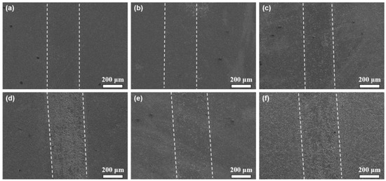 Wear mark morphology of the prepared (60 − x) TiCN-20WC-20Ni-xND cermets: (a) x = 0, (b) x = 1, (c) x = 3, (d) x = 5, (e) x = 7, and (f) x = 9.