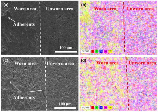 By comparing the EDS mapping spectra with the corresponding SEM images, it can be seen that the main element of the peeling pits is carbon (C), indicating that the peeling pits area is mainly a rich zone of graphite. Due to the low hardness of graphite, it peels off during the wear procedure, forming the peeling pits. The pits accelerated the wear of the samples in this experiment. However, the pits may store lubricating fluid to promote lubrication when the sample operates under the fluid lubrication conditions. In the adherent region, the main enriched element is tungsten (W), as shown in Figure 9b,d. The envisioned graphite lubricating layer was not clearly detected on the surface of the sample, indicating that the graphite formed by adding nano-diamond did not play a good lubricating role during the lubrication. According to previous studies, the formation of a continuous graphite-rich tribofilm is generally expected to reduce the coefficient of friction due to its low shear strength. However, in the present work, no such coherent lubricating film was observed. Instead, a closer examination of the worn surfaces reveals that the graphite phase is distributed discontinuously in the form of isolated C-rich pits and patches, which prevents the development of a stable tribochemical layer. Such discontinuity eliminates the friction-reducing capability that is normally associated with graphite. The identification of these peeling pits as graphite-enriched regions is based on their relative C enhancement compared with the surrounding TiCN matrix, accompanied by correspondingly reduced Ti and N signals, indicating local depletion of the TiCN phase and the accumulation of graphite generated during the nano-diamond transformation.