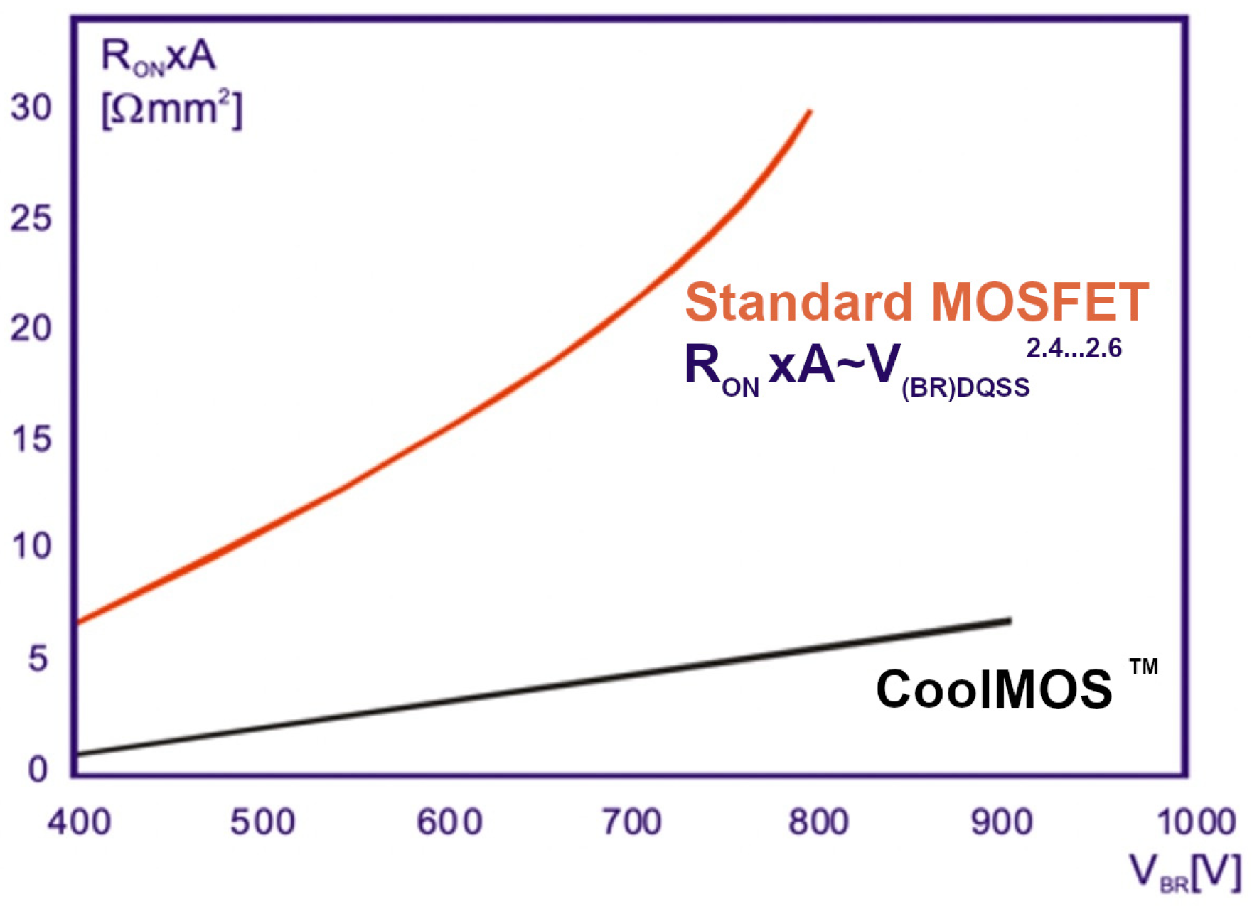 Figure 2. Comparison of theoretical relations between on-resistance RonxA and blocking voltage VBR presented in [2] for standard MOSFET and CoolMOS™, respectively.