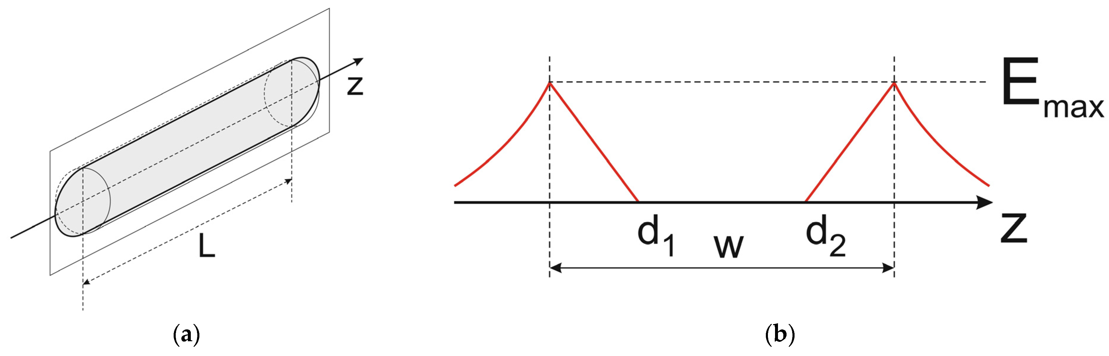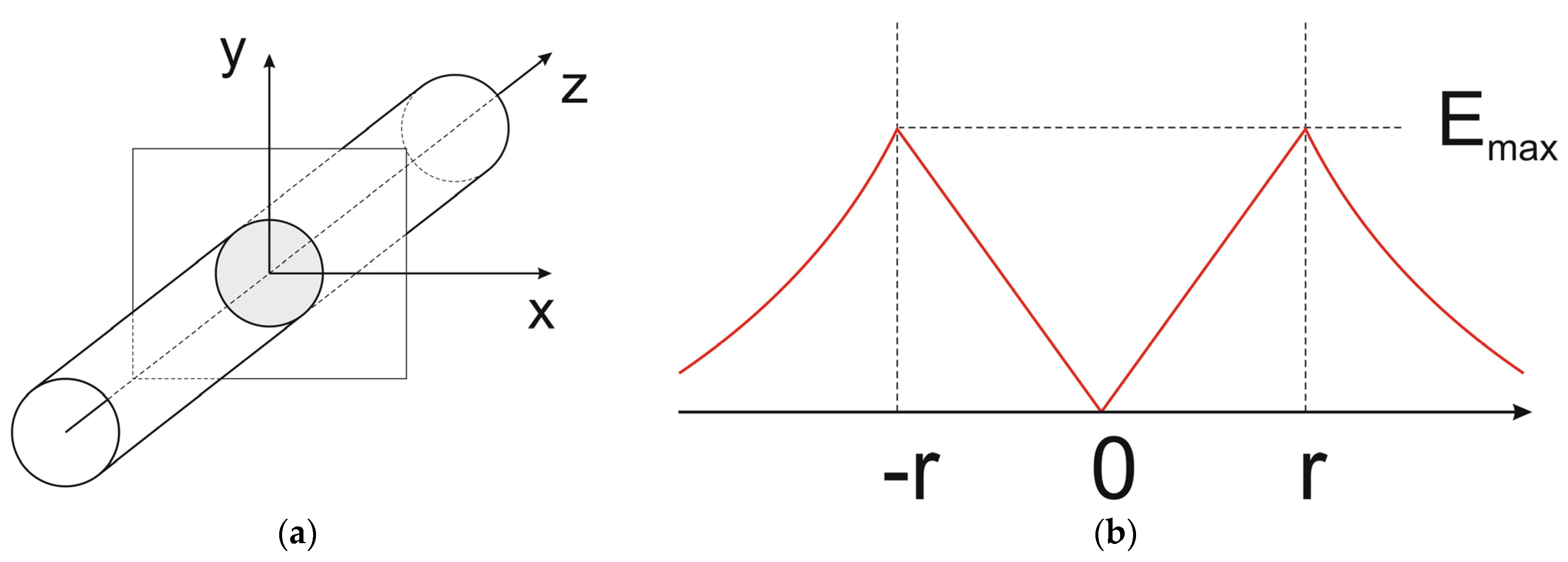 The situation takes place, e.g., in the infinite cylinder shown in Figure 4a with a homogeneous charge distribution. In any cross-section of the cylinder perpendicular to the z-axis, the same radially symmetrical electric field distribution with its maximal magnitude Emax on the cylinder surface shown in Figure 4b occurs, whereas the electric field strength along the z-axis is constant and, in particular, equal to zero on the z-axis. If the cylinder is terminated, e.g., by two semi-spheres like in Figure 5, the electric field distribution inside the cylinder changes a little, but in the central part of the cylinder, the region with constant electric field along the z-axis remains unchanged.