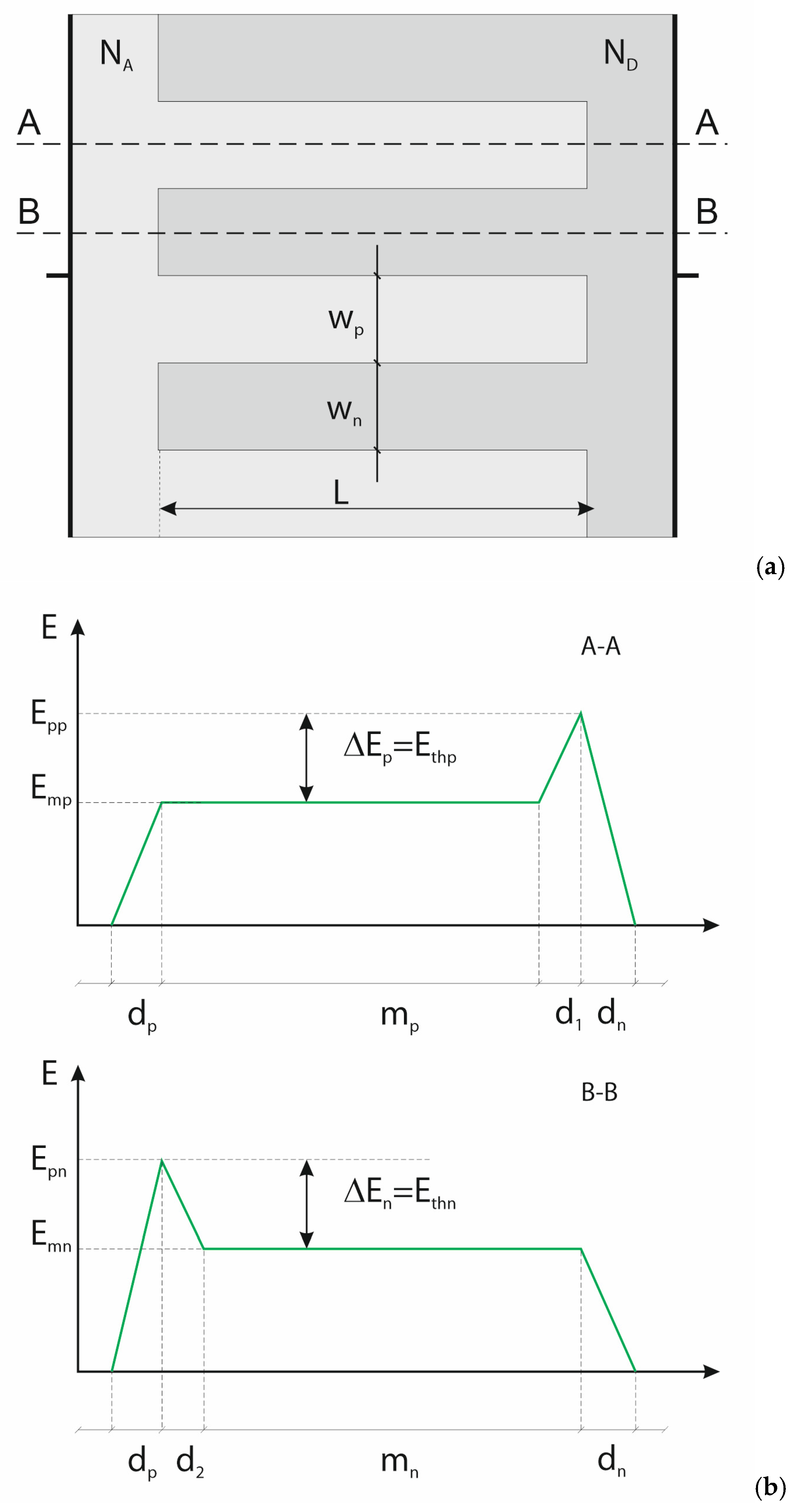 • Comparing (6), (7), and (1), one can notice that they are almost identical. They describe the same FFD phenomenon taking place in the diodes corresponding to p- and n-pillars of the superjunction diode in Figure 7 and the ideal p-i-n diode in Figure 3. Its presence leads to devices with generally unlimited blocking voltage. In the case of diodes corresponding to pillars in Figure 7, they can be formally considered as separate devices, although eventually they are aggregated into one device, which results in the identical length L and the identical maximal electrical field strength Epp = Epn. In the paper, the p-pillar diode is considered the main one, and next, the results are extended to the n-pillar diode.