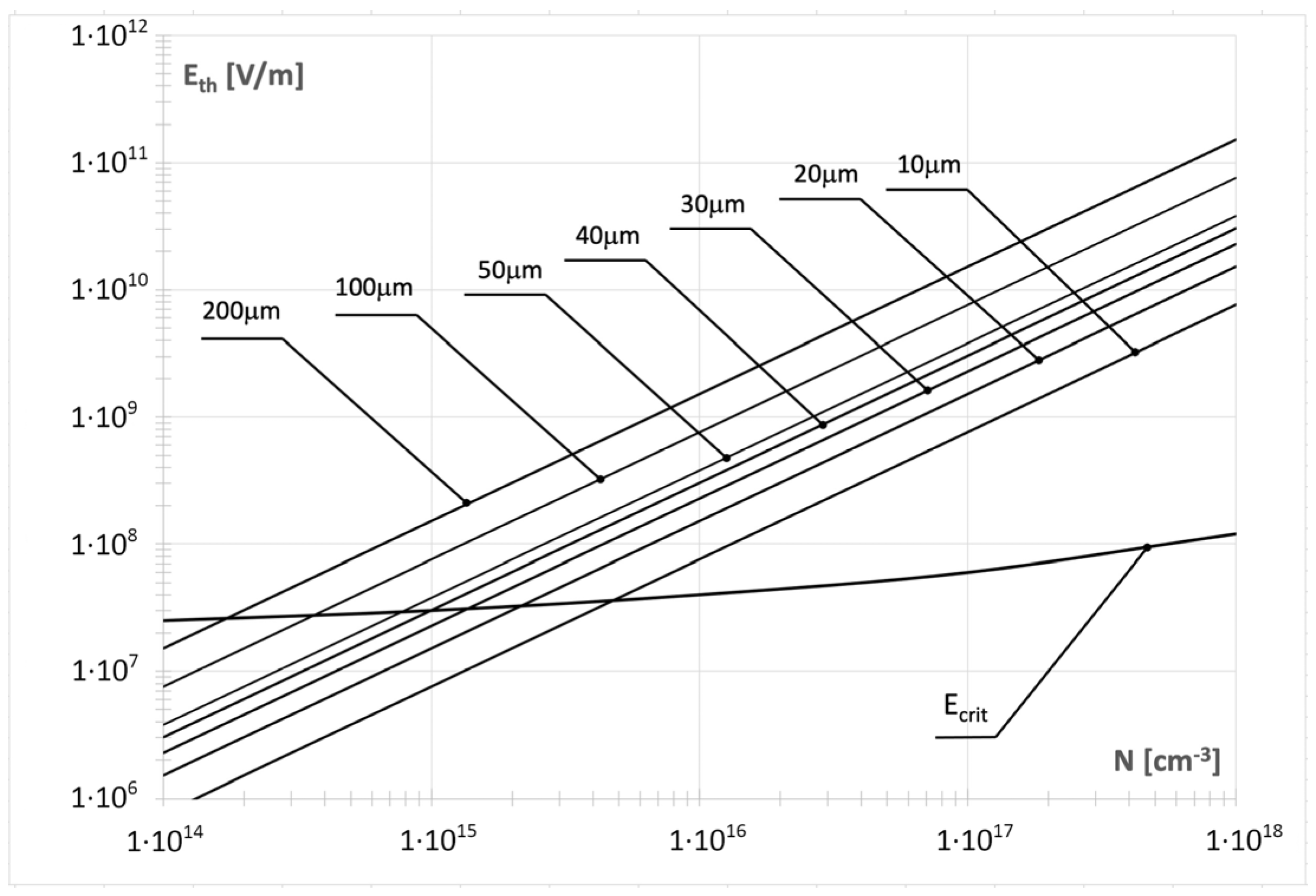 This analysis has been illustrated in Figure 8, where a set of linear characteristics Eth(N) for constant values of w was compared with the curve Ecrit(N), which represents the dependence of the critical electric field strength on the dopant concentration in silicon [13]. Each intersection point between the Ecrit(N) curve and the linear characteristics Eth(N) corresponding to a specific width w defines a condition in which the threshold electric field equals the critical electric field, Eth = Ecrit(N). At these points, the superjunction structure reaches its maximum efficiency, and the superjunction coefficient attains its highest value, γ = 1. In other words, these intersections mark the combinations of dopant concentration N and width w for which the superjunction effect fully contributes to the breakdown voltage, representing the ideal design condition for maximizing the performance of superjunction diodes.