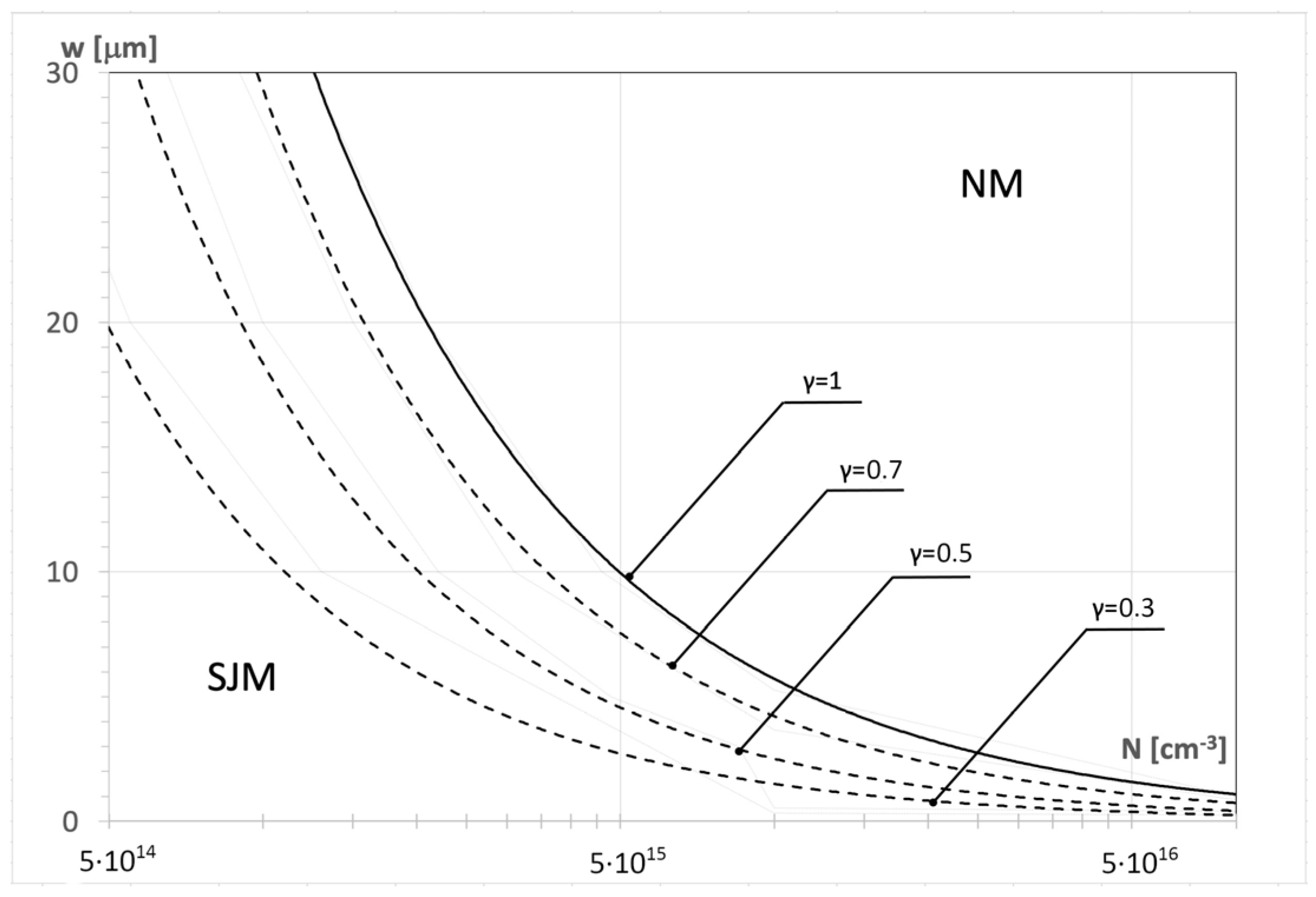 According to (10), it means that at the corresponding couples (N,w), the SJ electric field distribution already occurs, but corresponding to its superjunction compound VBSJ = 0. It is shown in a more useful way in Figure 9, which covers the curve presenting the relation between the dopant concentration N and the width w for γ = 1 (solid line). It divides the (N,w) domain into two parts. The bottom area, signed as SJM, gathers all the points (N,w) ensuring the design of diodes that can work in the superjunction mode with the superjunction component VBSJ > 0, whereas the upper area gathers the points corresponding to the diodes that, having the characteristic meander-like p-n junction shown in Figure 7a, can work in the normal mode only (NM).