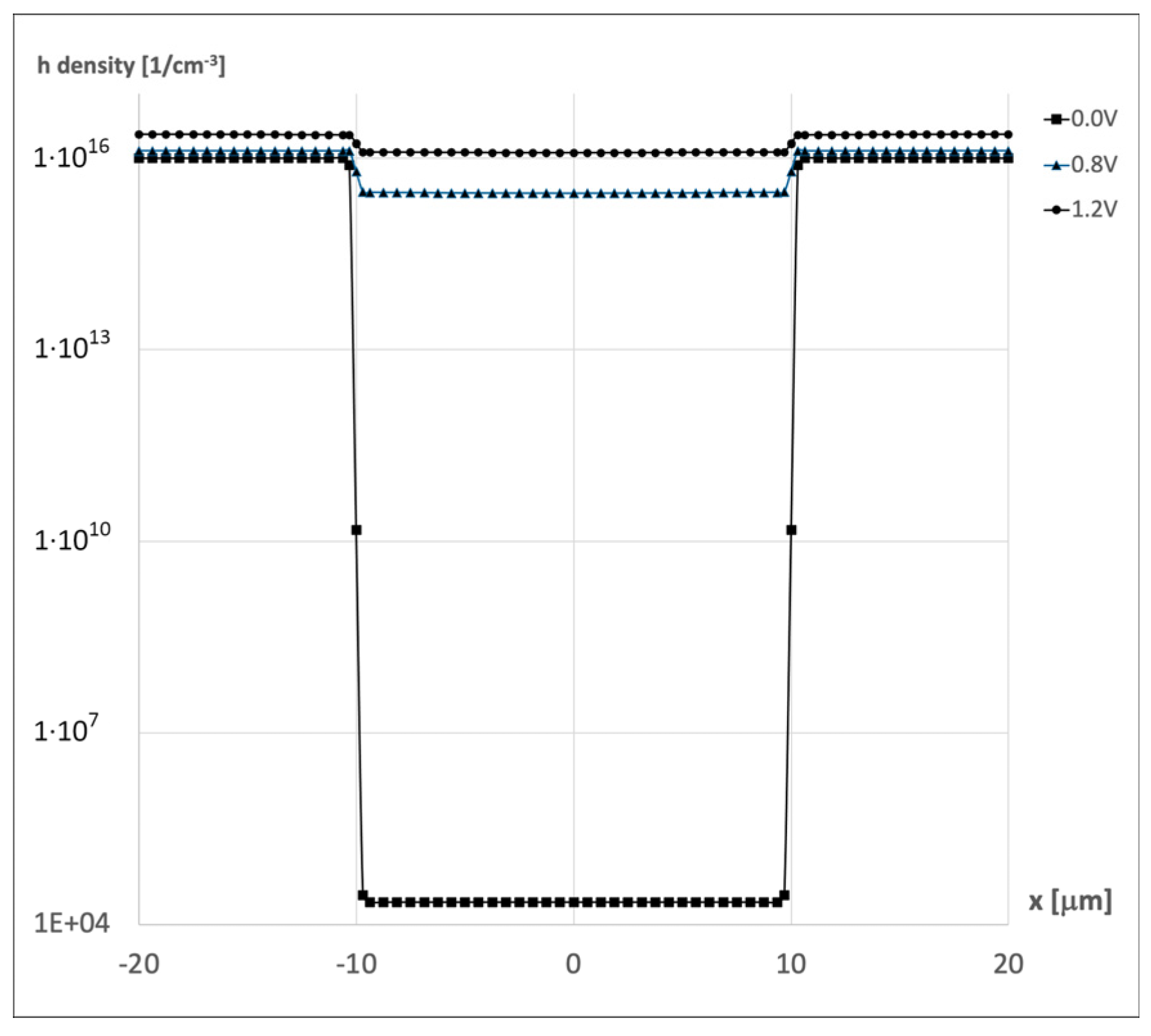 The above situation is illustrated by Figure 11. It presents the result of numerical simulation [26] showing the distribution of injected holes in the n-pillar when the n-pillar has the same doping as the p-pillar (NA = ND = 1·1016 cm−3).