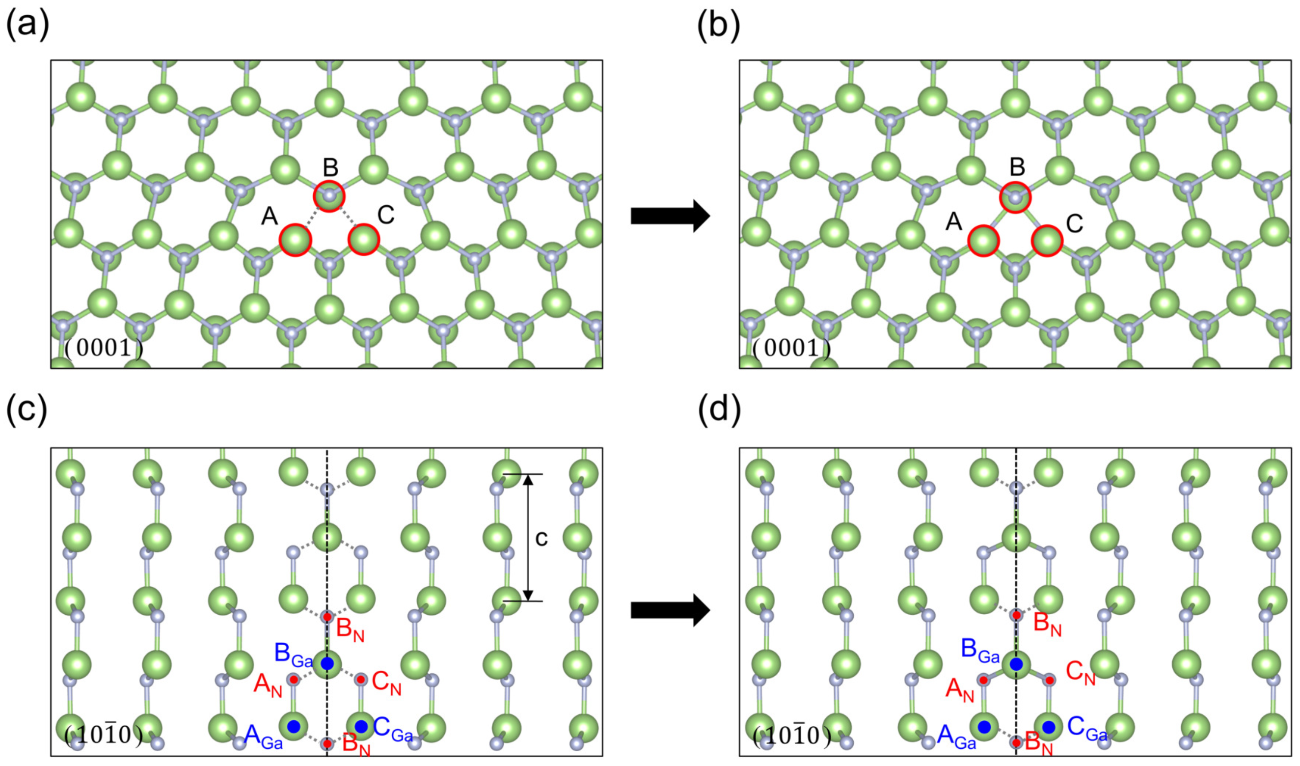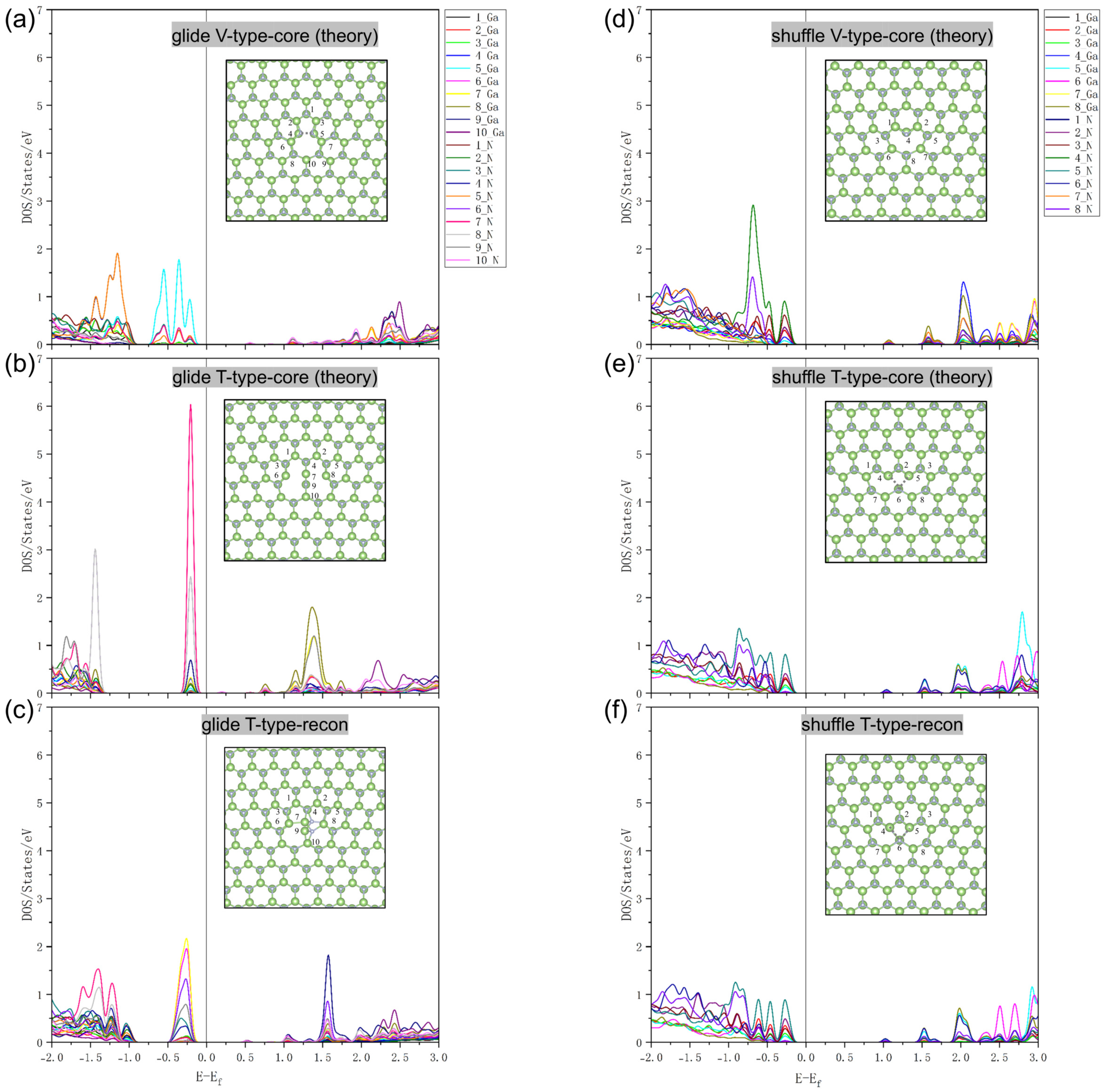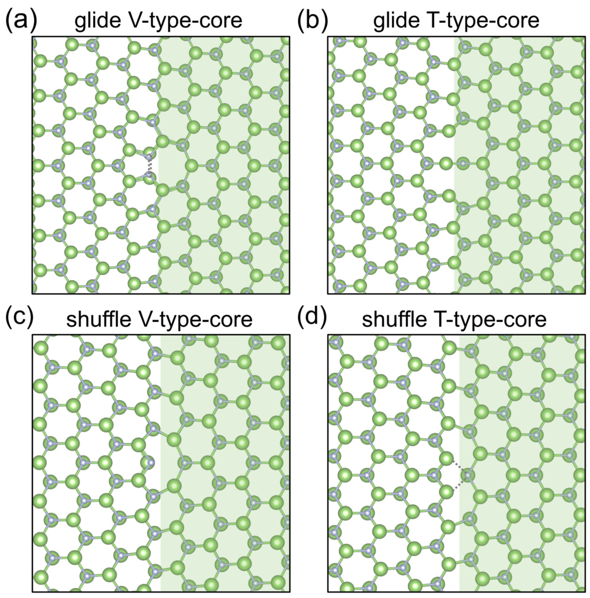 - Huang, L.; Wu, X.; Zou, Y.; Li, M.; Wang, R. Charge induced reconstruction of glide partial dislocations and electronic properties in GaN. Scr. Mater. 2022, 207, 114276. [Google Scholar] [CrossRef]