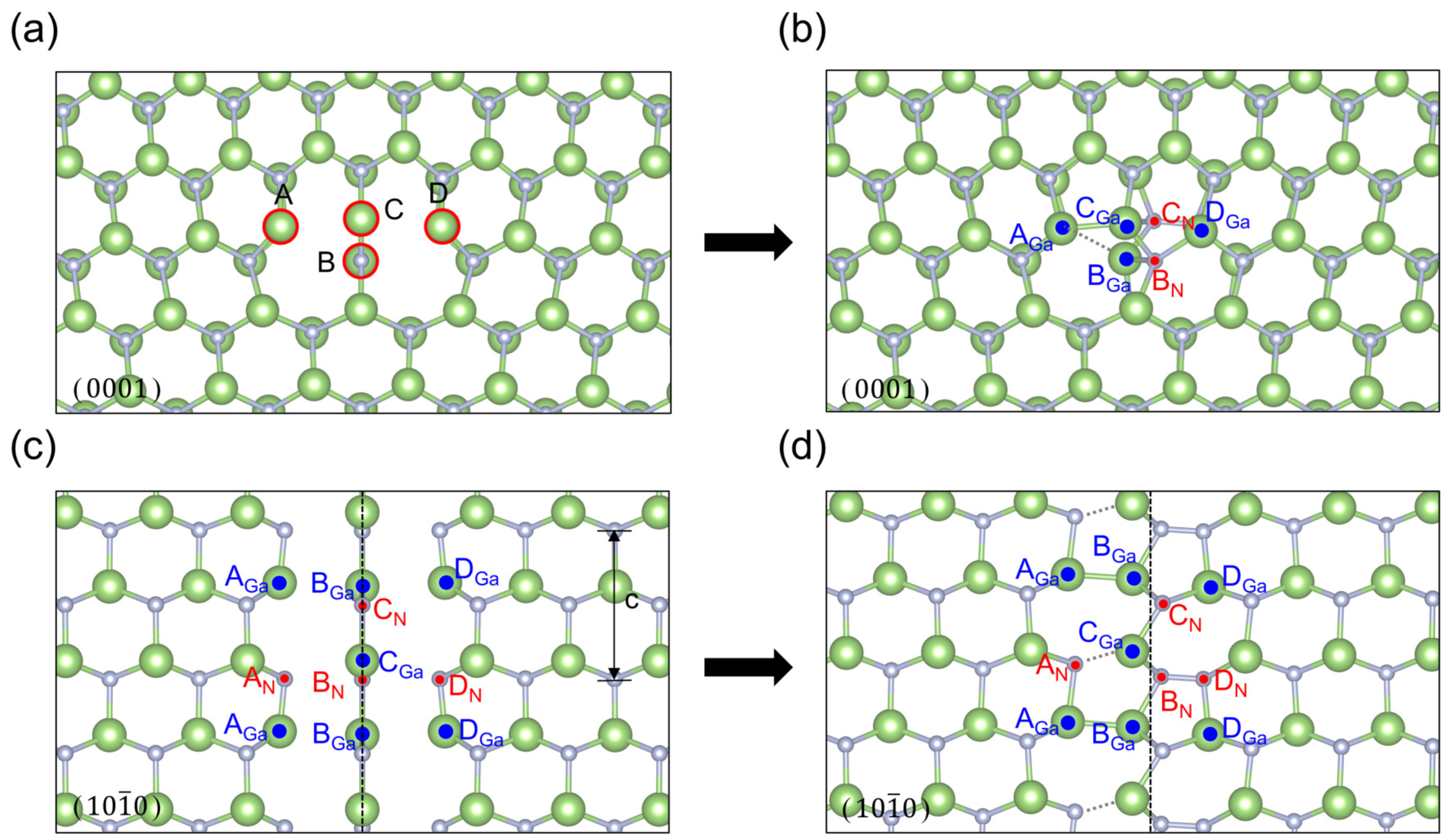 - Béré, A.; Serra, A. Atomic structure of dislocation cores in GaN. Phys. Rev. B 2002, 65, 205323. [Google Scholar] [CrossRef]