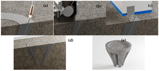 Combined SPI and WAAM process modified after [10]. (a) Printing a rebar, (b) spreading an aggregate layer, (c) cement paste application, (d) curing of the finished reinforced concrete element, and (e) excavated component.