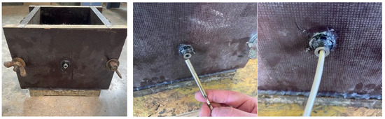 All specimens were compacted using a concrete vibrator (Wacker Irsen 18 mm 200 Hz, Munich, Germany) for 30 s. Immediately after compaction, the heating cartridge was inserted into the drilled WAAM rebar, and thermal loading commenced without delay. The bonded steel was then heated to a defined temperature. Due to the high power density of the cartridge heater, the target temperatures were reached within seconds after activation. The selected setpoints (60 °C, 80 °C, and 200 °C) were based on critical temperature thresholds reported in previous studies [13,14,15].