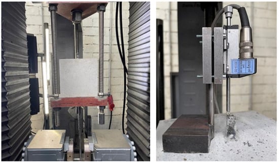 Pull-out tests were conducted according to RILEM RC6 [19]. Specimens were positioned on the support platen of a universal testing machine (Zwick Z600, Ulm, Germany) with the WAAM bar protruding vertically downward. Displacement was recorded at the unloaded bar end using a displacement transducer (FWA025TR, Ahlborn, Holzkirchen, Germany) mounted via a rigid bracket epoxied to the concrete, as shown in Figure 4.