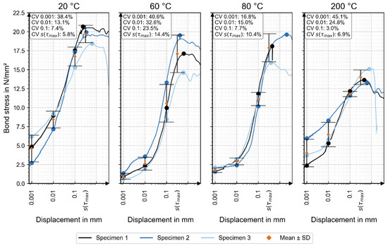 Detailed numerical results are provided as supplementary research data [22]. Figure 6 shows the individual bond-stress–displacement curves for all specimens. Table 3 shows the mean values of the bond stress depending on displacement and temperature load. The corresponding mean values (orange) and standard deviations are also included, with coefficients of variation (CV) indicated for each displacement level.