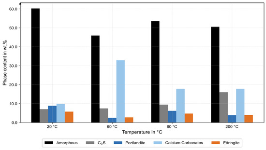 XRD analysis. Increased C3S at 200 °C (grey), decreased amorphous content at 60 °C (black), and higher carbonate content at 60 °C (light blue).
