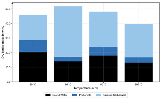 The TGA results confirm these trends: at 60 °C, the smallest loss of portlandite was observed, while the 200 °C specimen exhibited a pronounced mass loss in the range of 50 to 350 °C, indicating dehydration of the C-S-H phases (see Figure 8).