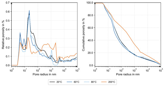 MIP analysis. Left: relative porosity; right: cumulative porosity. Nearly similar pore size distribution at 20 °C, 60 °C, and 80 °C. Shifted pore size distribution to larger pore radii (left), and increased total porosity (right) at 200 °C.
