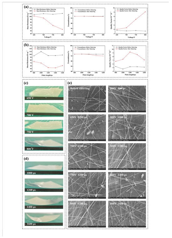 (a) Sheet resistance, transmittance, and quality factor of AgNW TCFs before and after flash lamp sintering at various voltages. (b) Sheet resistance, transmittance, and quality factor of AgNW TCFs before and after flash lamp sintering at various pulse lengths. (c) Digital images of AgNW TCFs after flash lamp sintering at various voltages. (d) Digital images of AgNW TCFs after flash lamp sintering at various pulse lengths. (e) SEM images (Magnification 25000) of AgNW TCFs prior to flash lamp sintering and subsequent to sintering through various sintering processes.