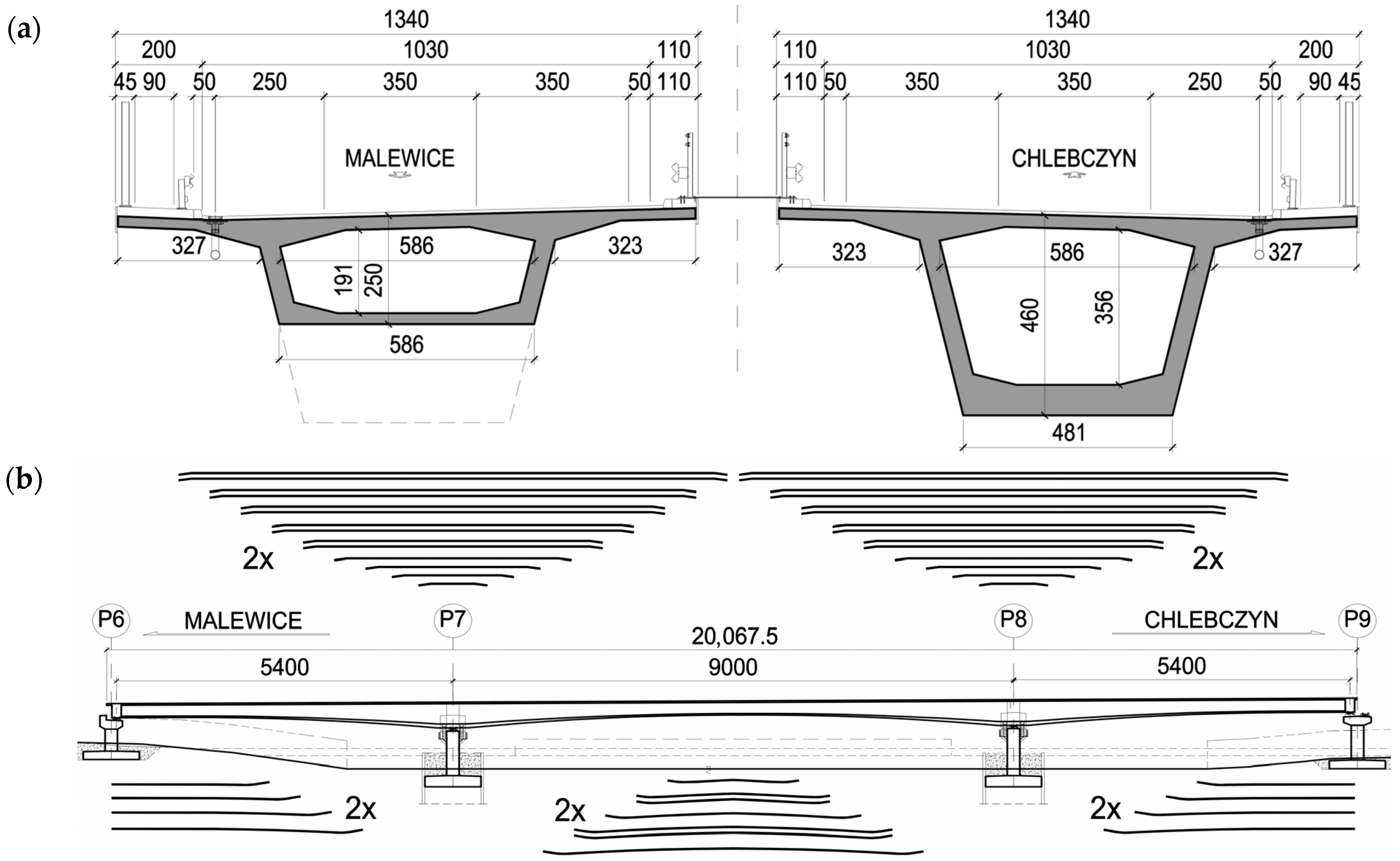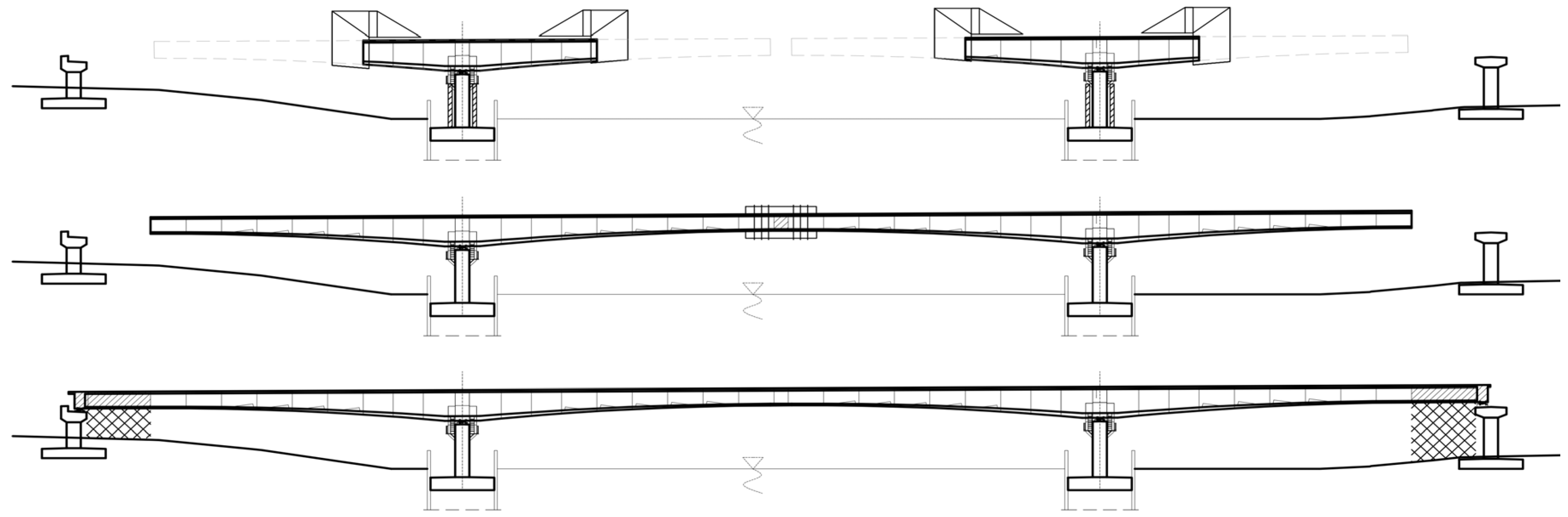 Section 4.2), during the balanced cantilever construction stages, full prestressing (no tension) was assumed, i.e., no tensile stresses occur in the deck slab near the prestressing cables. In the service phase after structure closure, under the characteristic SLS combination, limited prestressing (no cracking) was assumed, i.e.,