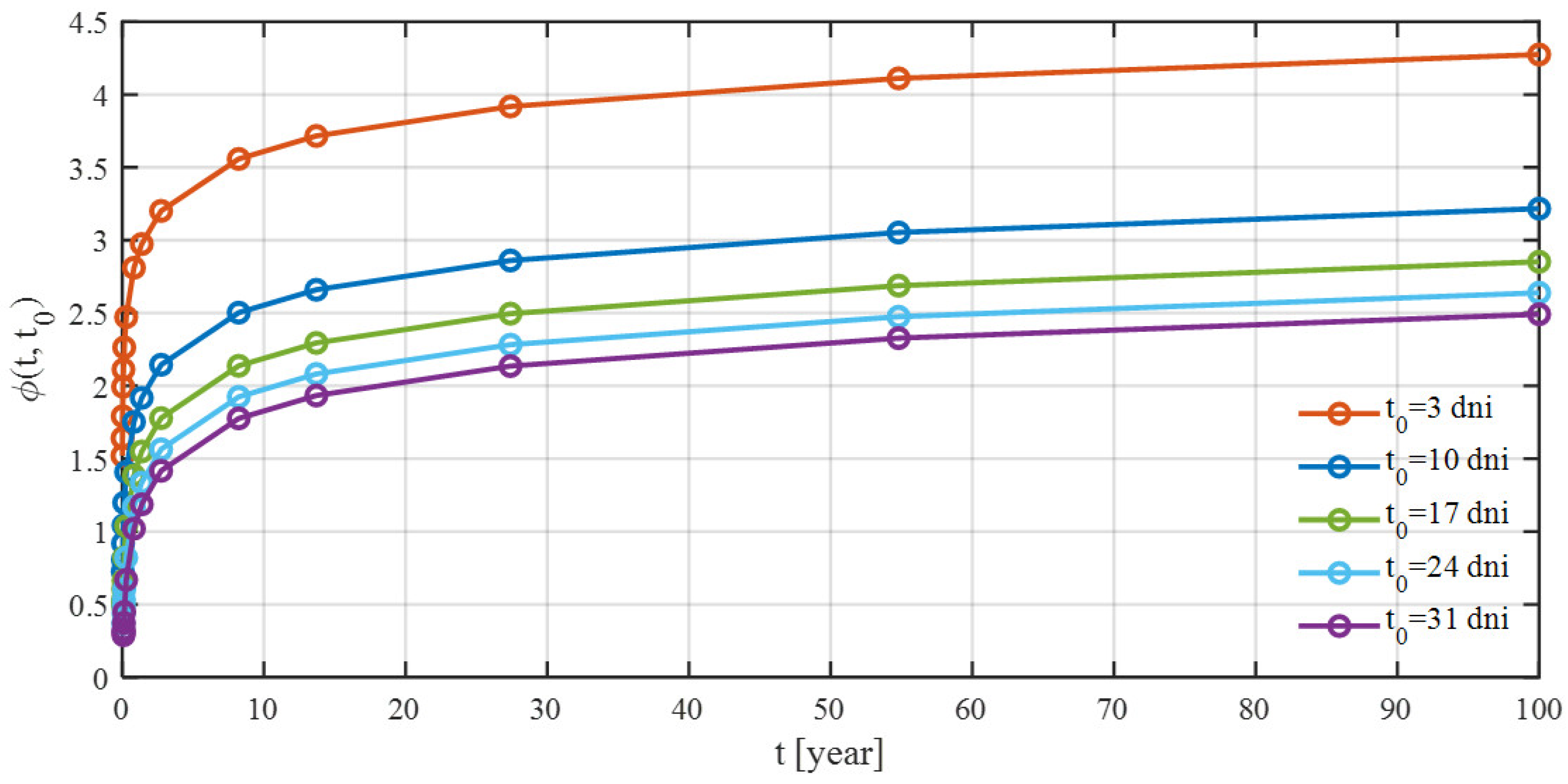 To accurately capture creep, a total of 22 curves describing its progression over time were generated using the B3 model. Each of these curves corresponds to the considered age of concrete at loading (3, 7, 10, 14, 17, 21, 24, 28, 31, 35, 38, 42, 45, 49, 56, 63, 70, 77, 90, 180, 360, and 1000 days). For bridges constructed using the balanced cantilever method, the age of concrete at loading varies between segments cast in successive construction cycles. For instance, assuming a 7-day construction cycle with prestressing applied 3 days after concreting, when prestressing segment SM-3, the concrete age at loading is 3 days. In the previously completed segments, SM-2 and SM-1, the concrete ages are 10 and 17 days, respectively. The change in the creep curve in the short term after concreting is very significant (
