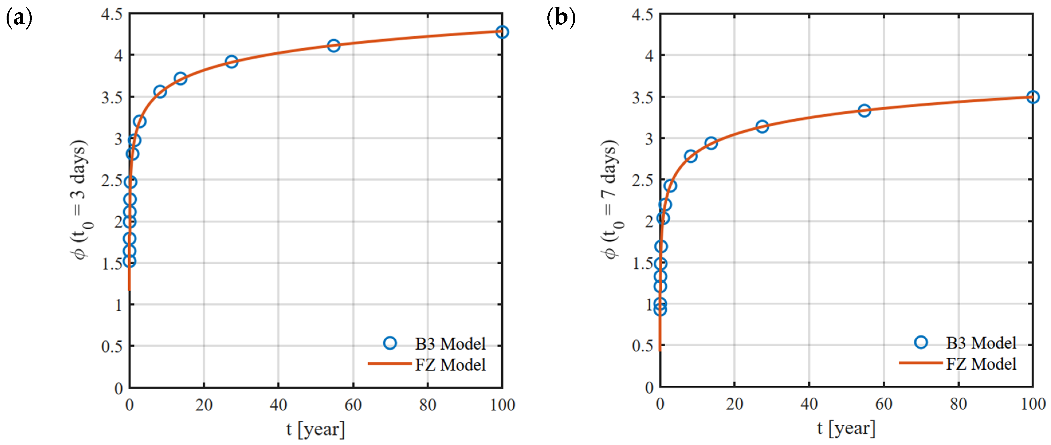 Section 2. Unlike the B3 model, the applied fractional Zener model is described by differential equations. As a result, it allows not only for the generation of creep curves but also for the simulation of the material’s response to arbitrary loading conditions. The model enables the analysis of creep, relaxation, and cyclic loading, which will be further developed and elaborated upon in the authors’ forthcoming papers.
