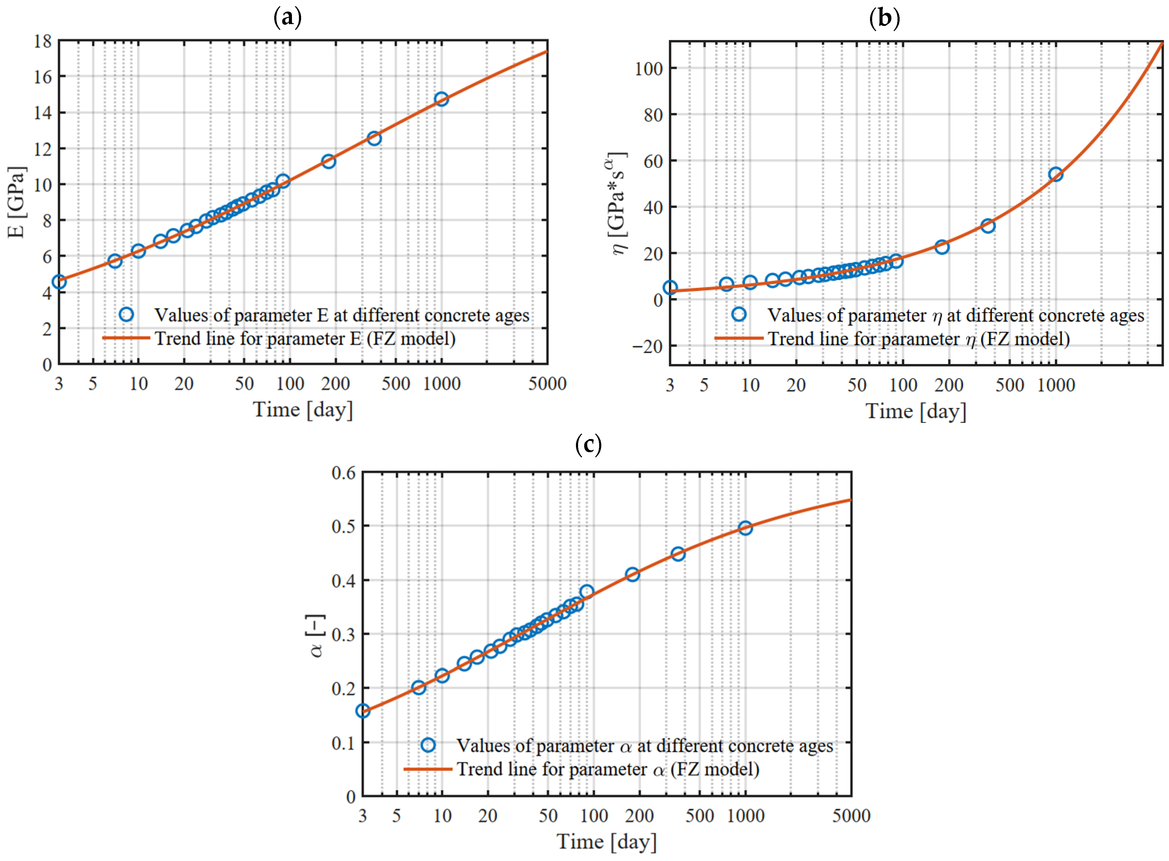 Figure 10). The trend lines for the parameters of the fractional Zener model were fitted using the Mittag–Leffler function, which provides an accurate representation of parameter evolution during concrete maturation.