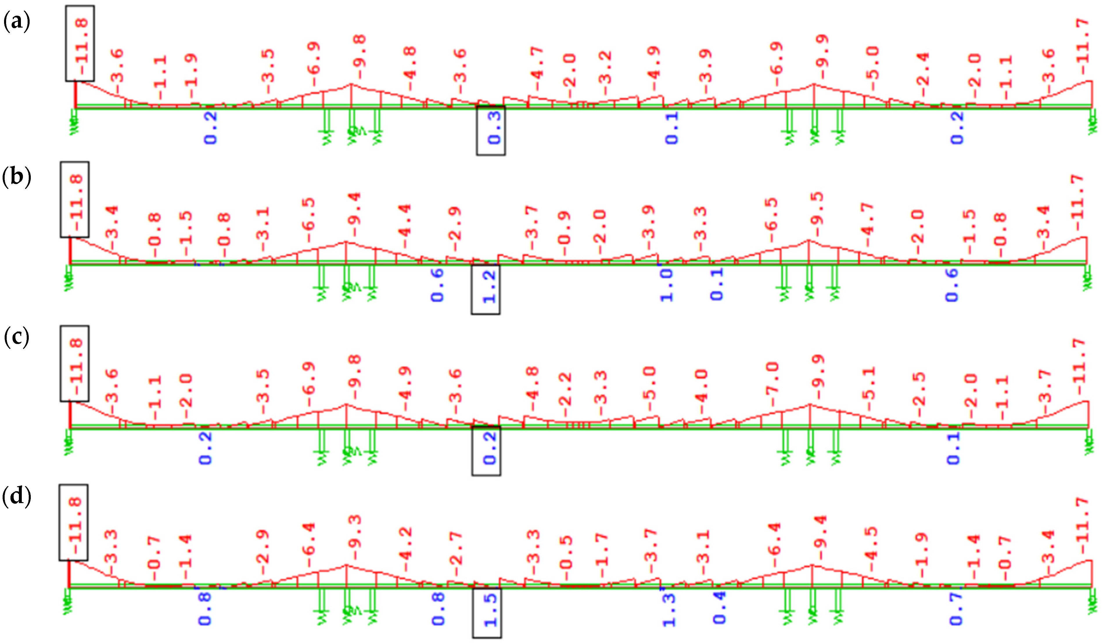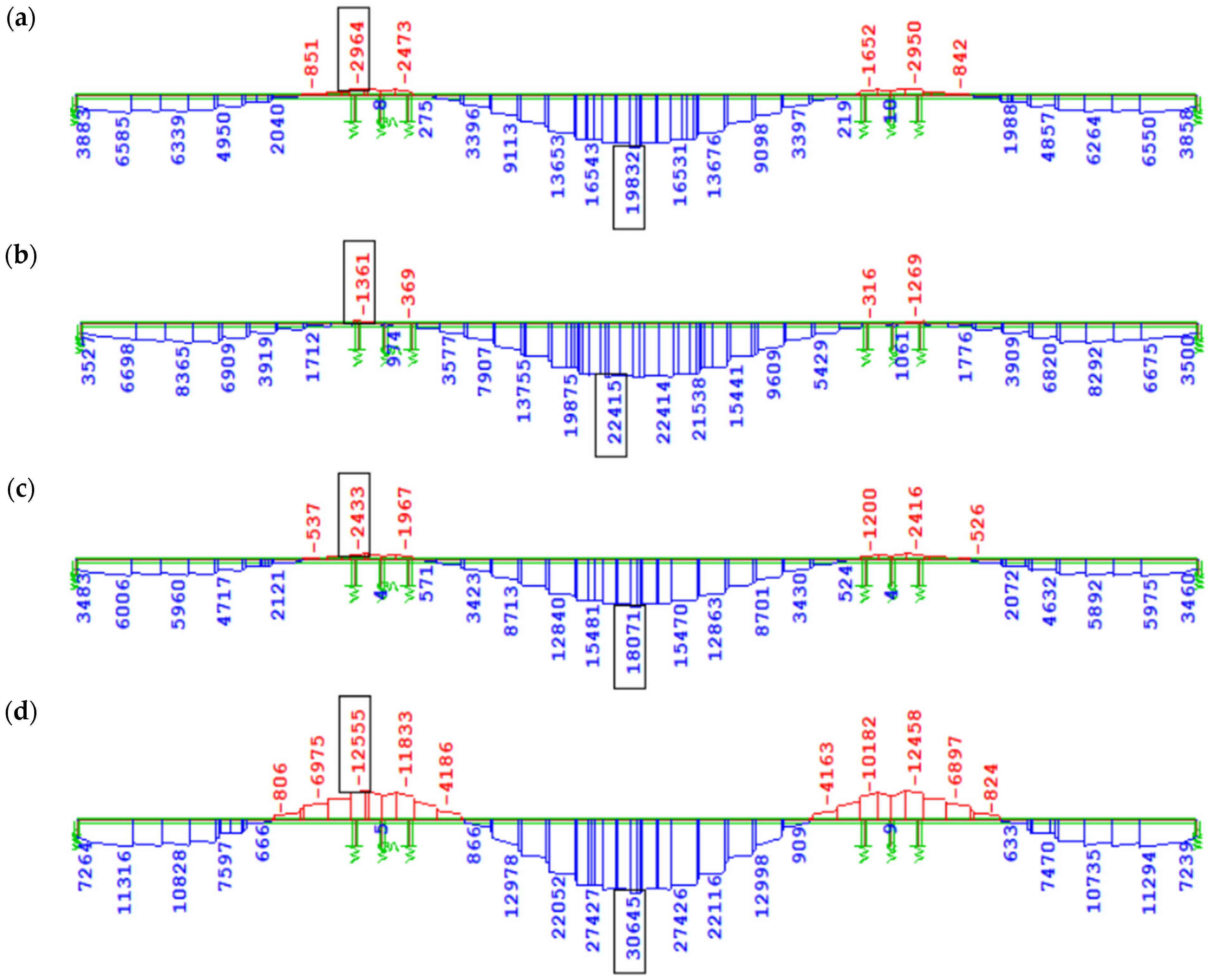 Figure 13a), i.e., |∆My| ≈ 14,000 kNm over the support and |∆My| ≈ 7000 kNm in the span. In variant W4 (