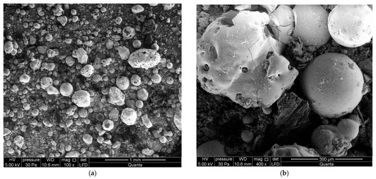 Crucially, the morphology and microstructural characteristics of the raw CFA particles were meticulously examined using scanning electron microscopy (SEM), model QUANTA FEG 250 (Amsterdam, The Netherlands) and a Nikon Eclipse Ci-LED microscope (Tokyo, Japan). The SEM analysis confirmed the typical heterogeneous nature of the fly ash, primarily comprising spherical, glassy cenospheres and plerospheres with varying diameters, as visually represented in Figure 1.