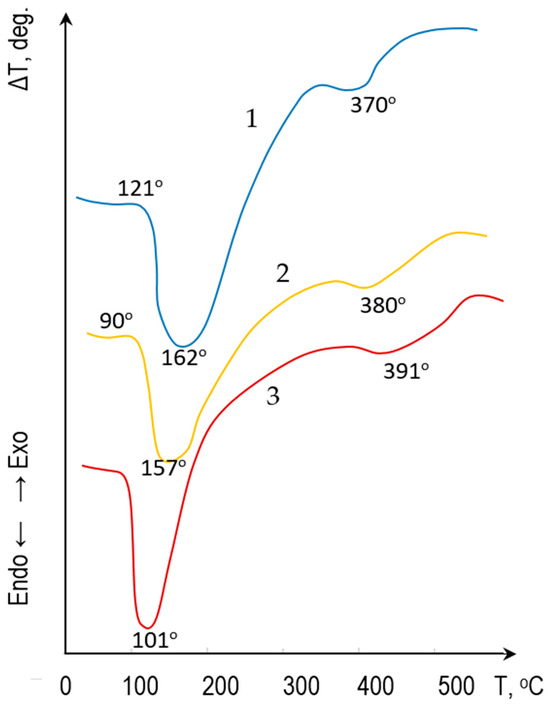 DTA of the raw mixture with varying compositions: 1—80 mass parts CFA and 5 mass parts OPC; 2—70 mass parts CFA and 15 mass parts OPC; 3—50 mass parts CFA and 30 mass parts OPC.