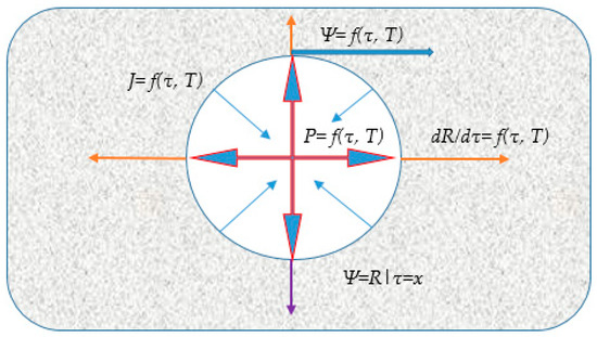 Schematic diagram of the vapor-gas pore growth model: P = f(T, τ)—the pressure exerted by the expanding vapor/gas inside the pore (red arrows); (T, τ)—viscous resistance exerted by the surrounding pyroplastic mass, acting against pore expansion (blue arrows); f(T, τ)—the mass flux (thin blue arrow); —the rate of pore radius growth (orange arrows), —stabilization condition (purple arrow).