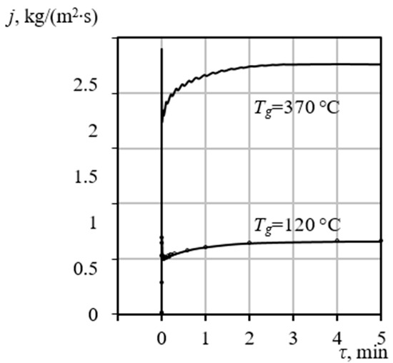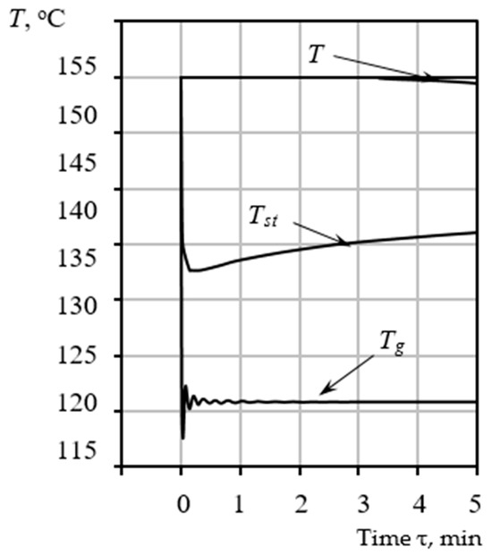 The resulting thermal treatment duration must be precisely coordinated with the kinetically required contact time (as established in Section 3.4). While an excessively long heating period will not inherently damage the material structure, a duration that is too short will result in a porous structure with characteristics below the design specifications. A key feature of this model is the incorporation of the dynamic change in particle diameter during the drying and pore-forming processes (Figure 4), which significantly affects the aerodynamic interaction with the gas phase. Therefore, the particle temperature must be calculated simultaneously with its trajectory.
