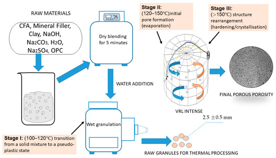 In existing literature, the initial stage of porous structure formation typically involves preparing a plastic composition that is subsequently subjected to thermal treatment at various temperatures. The resulting porosity type and pore dimensions are directly dependent on the applied temperature. Generally, these studies primarily focus on identifying the optimal blend of raw materials. Our research adopts a similar foundational strategy, but we uniquely rely on the application of technogenic components predominantly contained within CFA and OPC. Thus, our method for PM production is distinguished by its mixture composition, initial volume content, consistency, and the specific technique for porous structure formation. Detailed accounts of this method are presented in our previously published works [47,48].