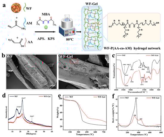 Overview of WF and WF-Gel characterization: (a) Hydrogel network formation, (b) SEM microstructure, (c) FTIR spectra, (d) XRD patterns, (e) TGA curves, and (f) DTG profiles of WF and WF-Gel.