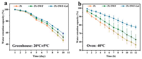 It is crucial to evaluate the water retention behavior of WF-Gel for soilless substrate applications as the hydrogel-modified WF can guarantee that more water and nutrients are retained in the substrate, providing relatively long-term water release. Figure 2 shows the water retention capacity of Pt and Pt blended with WF or WF-Gel under different temperature conditions. All growing substrates gradually decrease in water content over time, regardless of whether they were under common or relatively high temperature conditions. Under the greenhouse testing conditions, the blended growing substrate Pt+5WF-Gel had the best water retention performance and retained nearly 60% water on the 10th day, which is 5% and 10% higher than Pt+5WF and Pt, respectively (Figure 2a). Especially under high temperatures (Figure 2b), Pt+5WF-Gel retained nearly 80% water at the 12th hour, while Pt and Pt+5WF retained around 55% and 60% at the same time, respectively. The presented results mean that the use of hydrogel-modified WF can significantly promote the long-term supply of water, reducing the watering frequency and increasing water-use efficiency [34]. This modification strategy of WF likely provides an efficient way to ameliorate the water retention behavior of plant fibrous material as a growing medium [16]. Furthermore, the superior water retention performance of WF-Gel can be attributed to the synergistic interaction between the porous structure of wood fiber and the high absorbency of the grafted hydrogel network. While WF alone improves rehydration due to its natural capillary channels, the hydrogel layer further traps water within the three-dimensional polymer matrix and slows evaporation. This dual mechanism has also been observed in other composite systems such as biochar–hydrogel and cellulose–hydrogel materials, which similarly demonstrate prolonged moisture release and reduced irrigation needs compared with untreated substrate components [20,21].