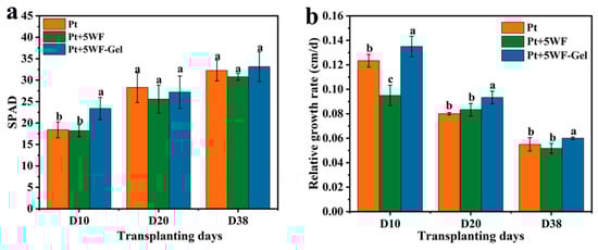 A similar trend was observed for relative growth rate (RGR) in Figure 3b. Choy sum in the WF-Gel substrate showed the highest RGR (0.135 cm/d) at D10, significantly exceeding that in Pt (control) and Pt+5WF, whereas the substrate containing raw WF caused growth inhibition (RGR = 0.095 cm/d). As the experiment progressed, differences in RGR among substrates gradually decreased; however, plants in Pt+5WF-Gel continued to exhibit significantly higher growth rates at D20 and D38. These results demonstrate that the hydrogel modification of WF enhances plant growth by improving water and nutrient retention, in agreement with previous reports using hydrogel-amended substrates [22,34,39].