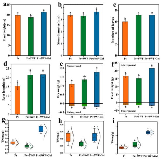 The growth indices of choy sum include (a) plant height, (b) stem diameter, (c) number of leaves, (d) root length, (e) fresh weight, (f) dry weight, (g) total nitrogen content (TN), (h) total phosphorus content (TP), and and (i) total potassium content (TK). Bars represent mean ± standard deviation (SD, n = 6). Different letters above the bars indicate significant differences (p < 0.05).