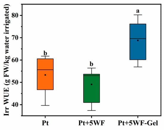 Irrigation water-use efficiency (Irr WUE) of choy sum under different treatments. The black squares indicate the mean values. Bars represent mean ± standard deviation (SD, n = 6). Different letters above the bars indicate significant differences (p < 0.05).