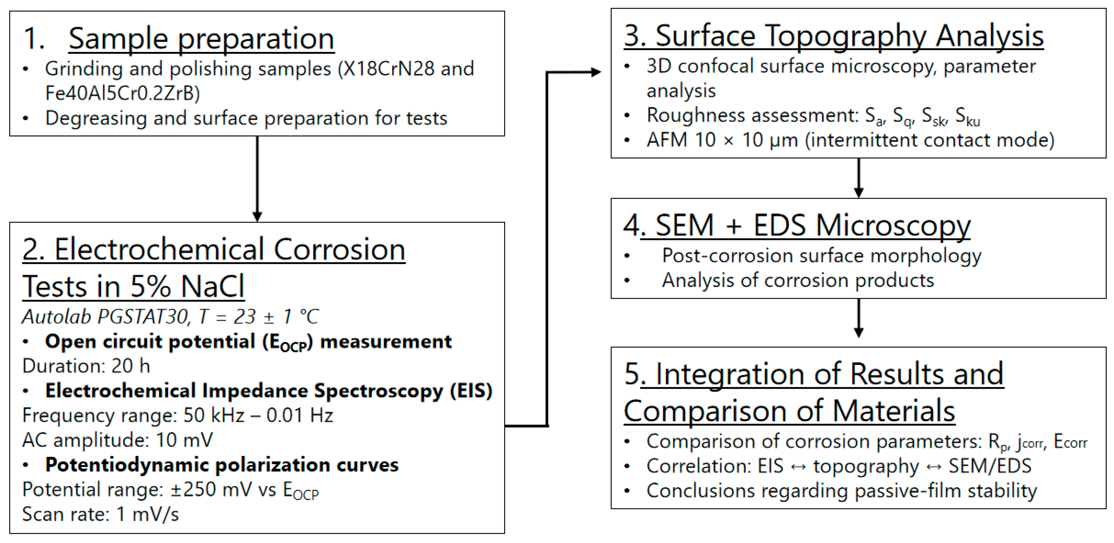 - The material ranking derived from electrochemical methods is consistent with topographical and corrosion-product analyses.