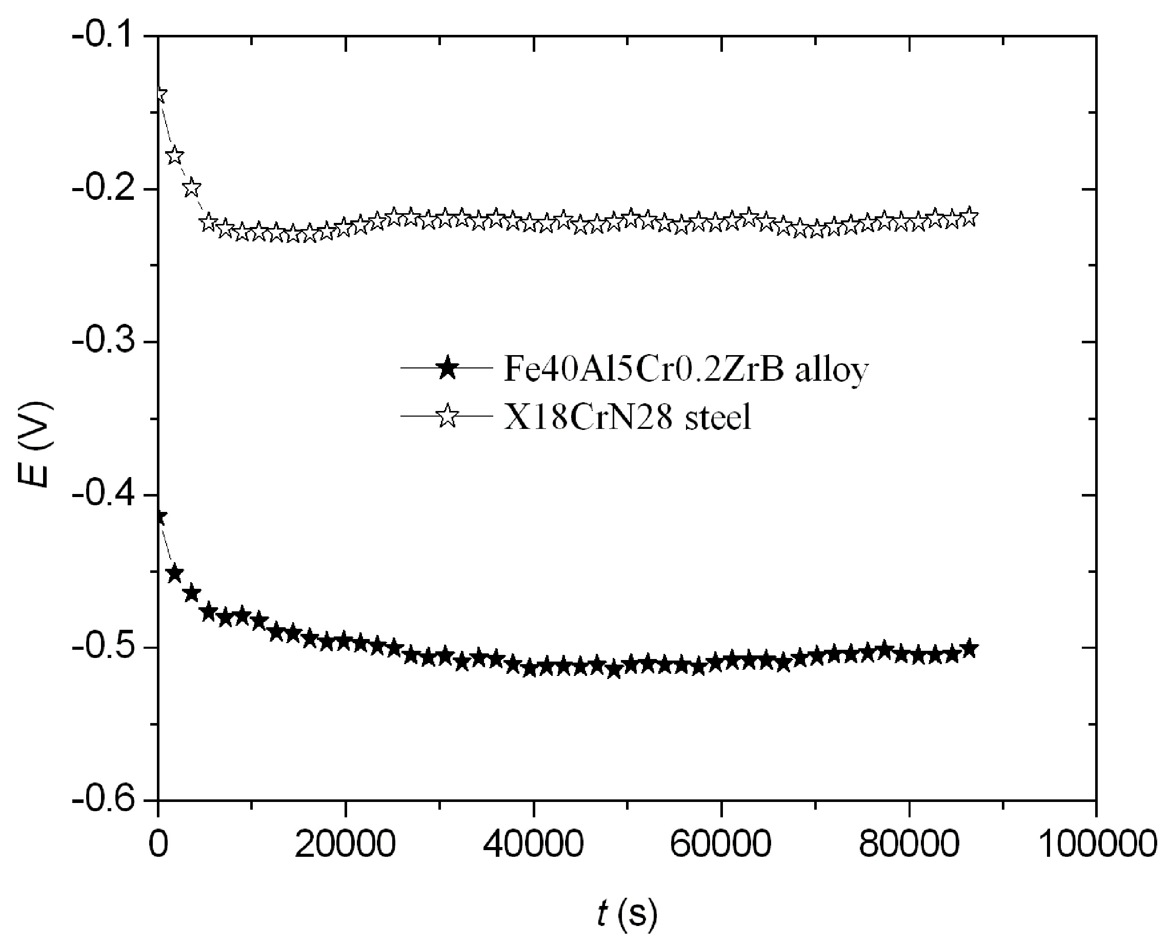 - Corrosion resistance of the Fe40Al5Cr0.2ZrB alloys and X18CrN28 steel was investigated in 5% NaCl solution using AUTOLAB® system (PGSTAT30, Metrohm Autolab B.V., Utrecht, The Netherlands). A platinum mesh served as the counter electrode, and a saturated calomel electrode (SCE) was the reference electrode. These tests included the open-circuit potential measurement within 20 h, electrochemical impedance spectroscopy, and potentiodynamic polarization. EIS studies were performed at the open-circuit potential (frequency range from 50 kHz to 0.01 Hz (10 points per decade), amplitude of the ac signal 10 mV, room temperature). Potentiodynamic curves were registered within a potential range of ±250 mV relative to the open-circuit potential at a rate of 1 mV·s−1.