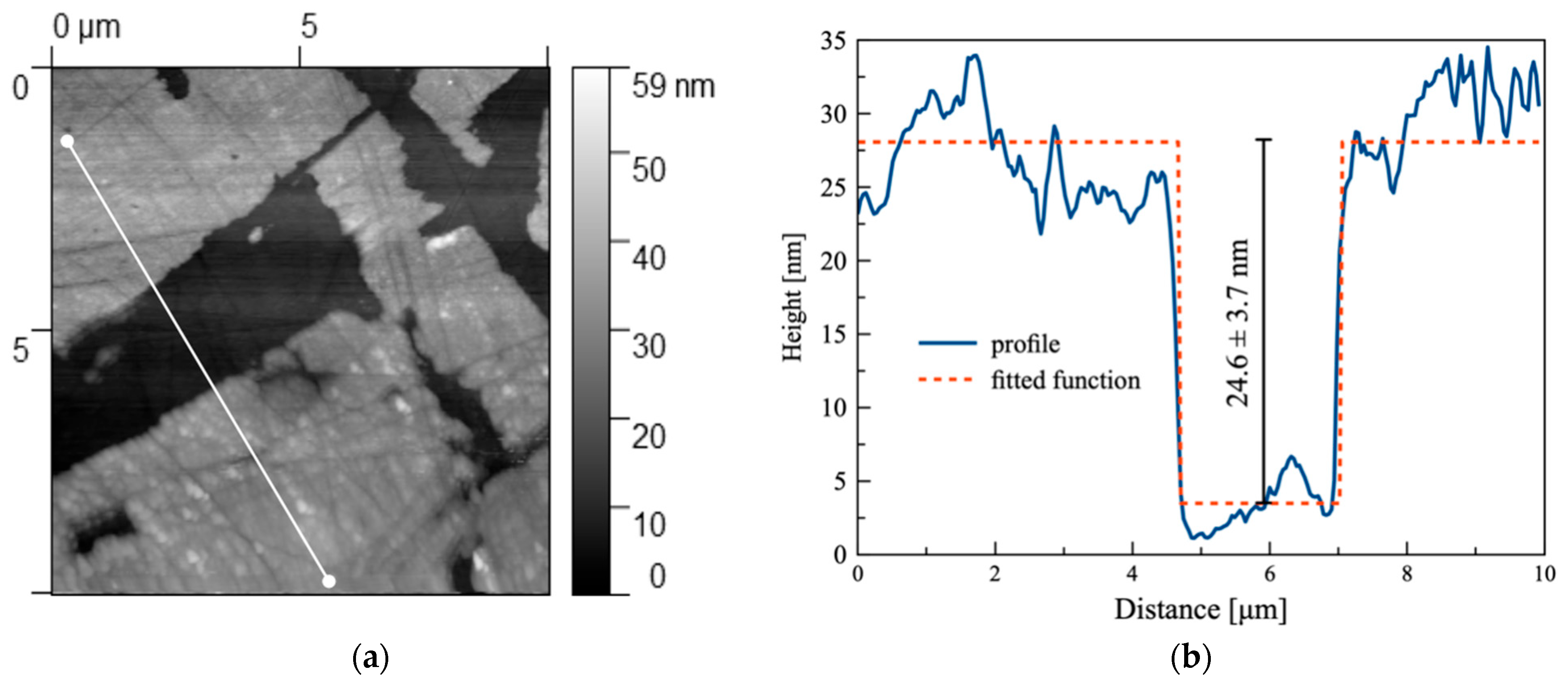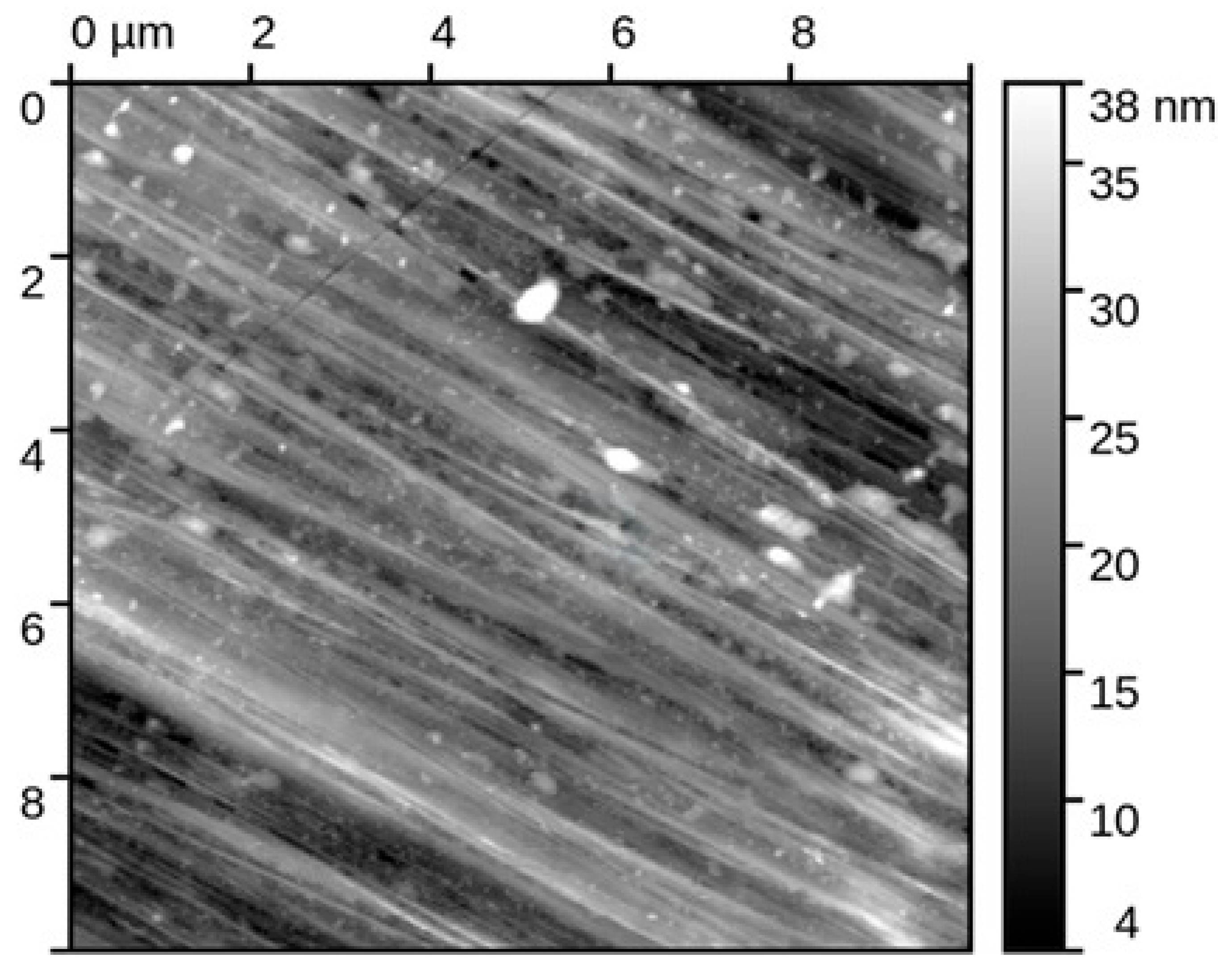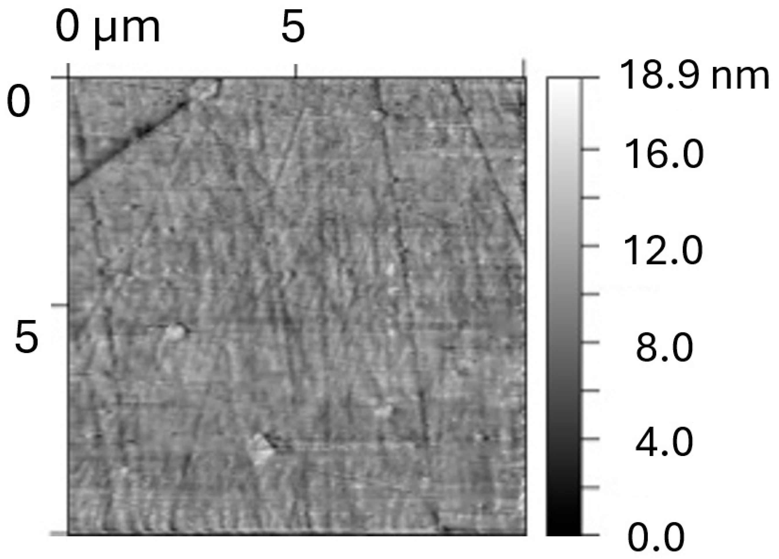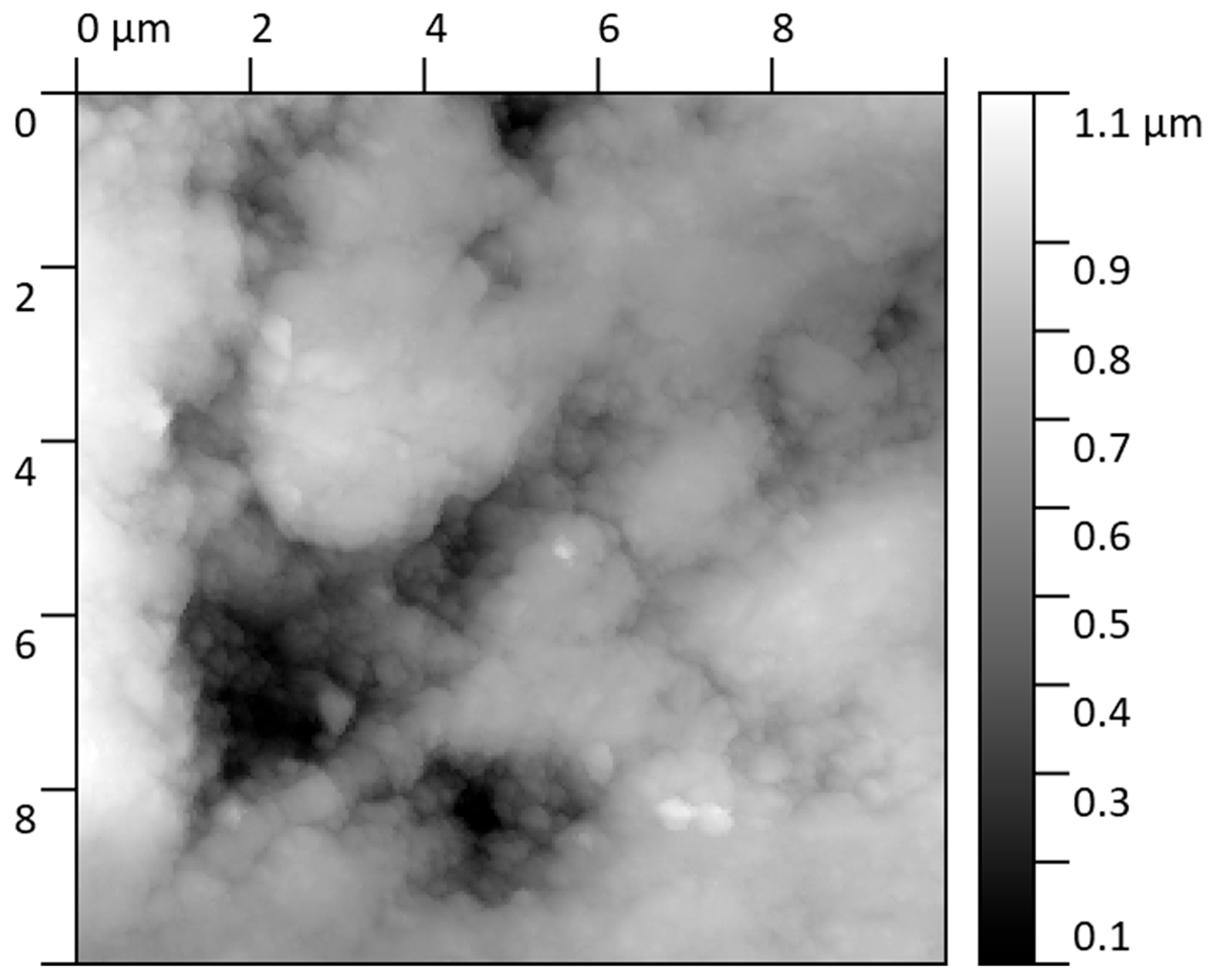 - AFM—Measurements were performed using the intermittent contact method. Sample topography was recorded on 10 × 10 µm surfaces. Images were processed using standard Gwyd-dion 2.63 software (align rows, mean plane subtraction, shift minimum data to zero). Roughness parameters Sq (Root Mean Square Roughness) and Sa (Arithmetic Mean Height) were determined.