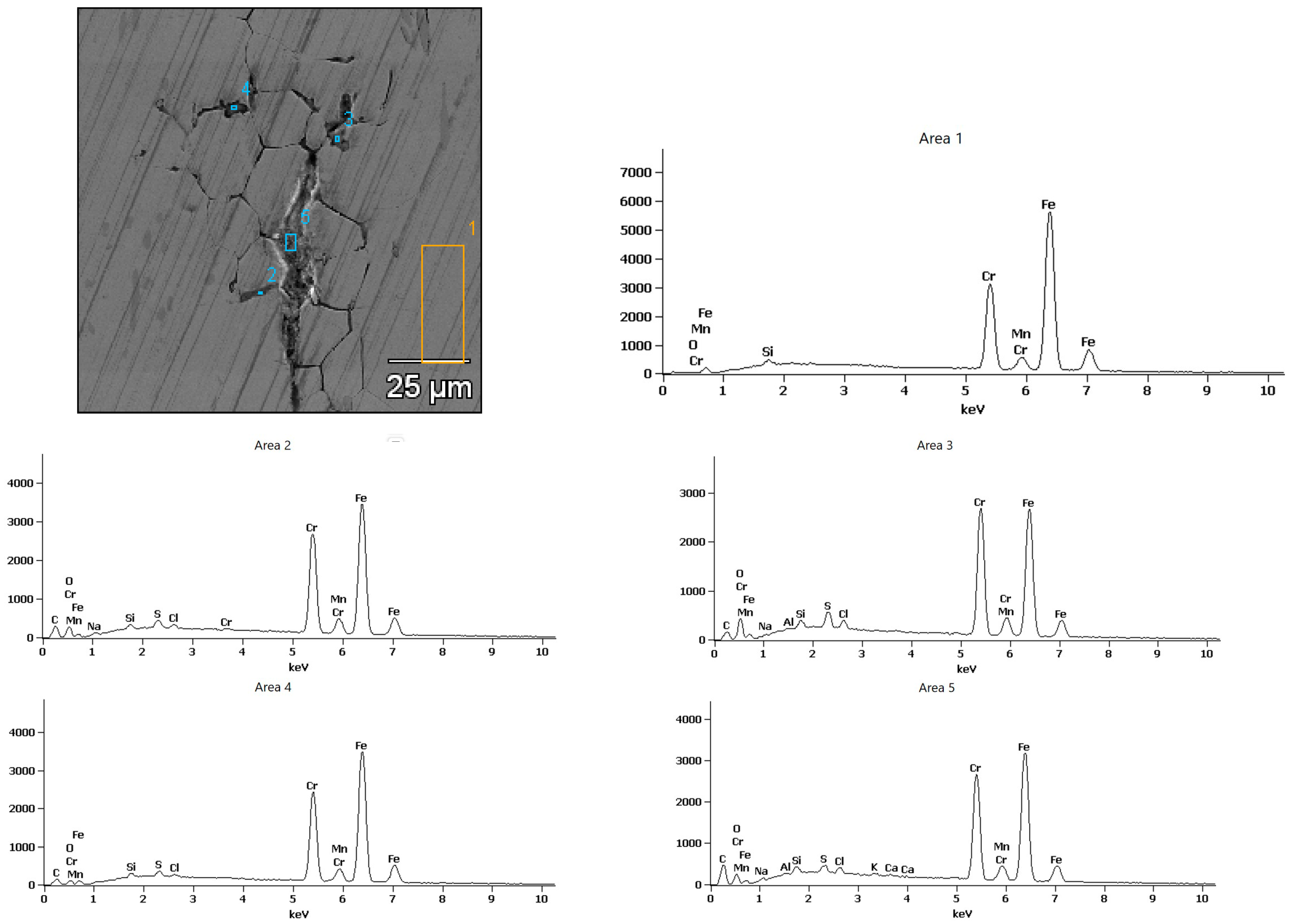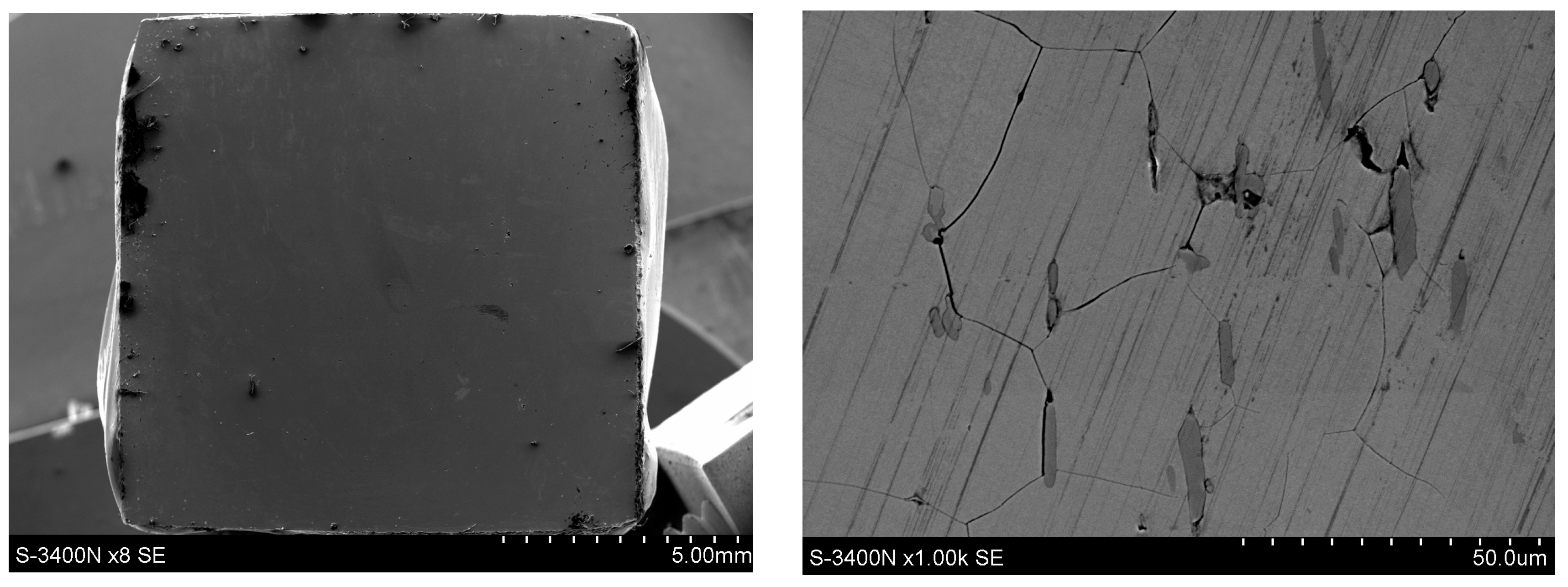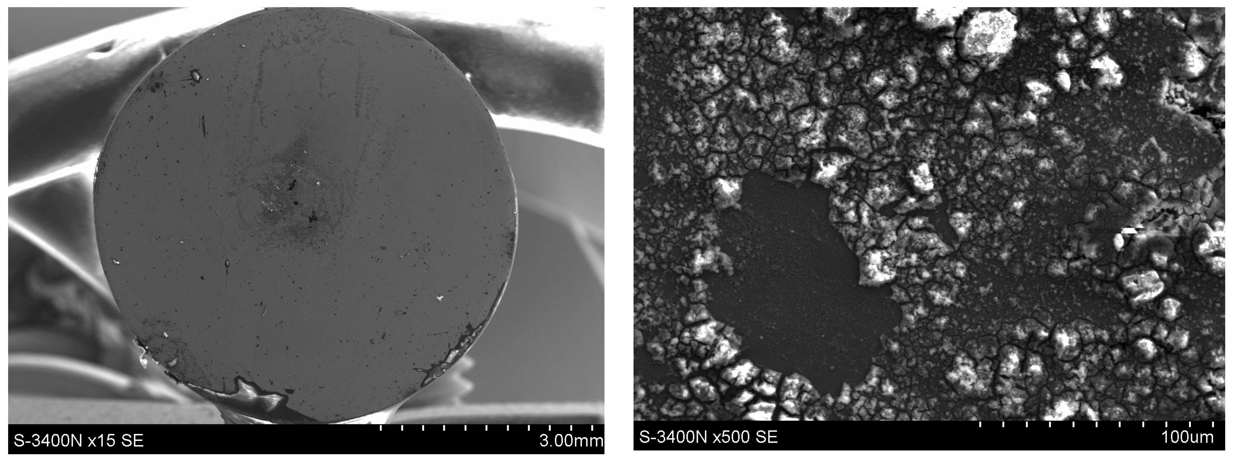 - The surface appearance of the samples following corrosion tests was examined using scanning electron microscopy (SEM) with a Hitachi S-3400 (Tokyo, Japan). The chemical composition of oxidation products on the solid samples was analyzed using an energy dispersive X-ray spectrometer (EDS) by ThermoNoran (System Seven) (Waltham, MA, USA), operated at an electron beam accelerating voltage of 15 keV. The spectrometer connects to the microscope.